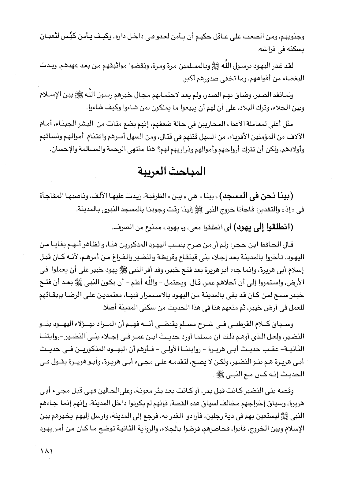 وقصة بني النضير كانت قبل بدر أو كانت بعد بئر معونة وعلى الحالين فهي قبل مجيء أبي هريرة وسياق إخراجهم مخالف لسياق هذه القصة فإنهم لم يكونوا داخل المدينة وإنهم إنما جاءهم النبي صلى الله عليه وسلم ليستعين بهم في دية رجلين فأرادوا الغدر به فرجع إلى المدينة وأرسل إليهم يخيرهم بين الإسلام وبين الخروج فأبوا فحاصرهم فرضوا بالجلاء والرواية الثانية توضح ما كان من أمر يهود