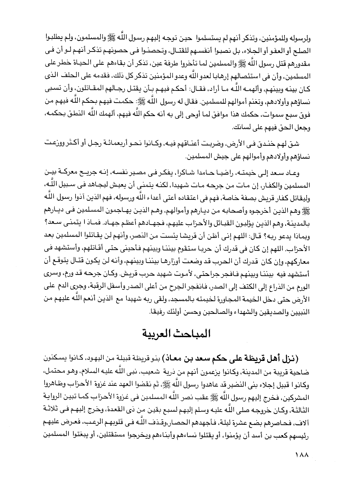 (نزل أهل قريظة على حكم سعد بن معاذ) بنو قريظة قبيلة من اليهود كانوا يسكنون ضاحية قريبة من المدينة وكانوا يزعمون أنهم من ذرية شعيب نبي الله عليه السلام وهو محتمل وكانوا قبيل إجلاء بني النضير قد عاهدوا رسول الله صلى الله عليه وسلم ثم نقضوا العهد عند غزوة الأحزاب وظاهروا المشركين فخرج إليهم رسول الله صلى الله عليه وسلم عقب نصر الله المسلمين في غزوة الأحزاب كما تبين الرواية الثالثة وكان خروجه صلى الله عليه وسلم إليهم لسبع بقين من ذي القعدة وخرج إليهم في ثلاثة آلاف فحاصرهم بضع عشرة ليلة فأجهدهم الحصار وقذف الله في قلوبهم الرعب فعرض عليهم رئيسهم كعب بن أسد أن يؤمنوا أو يقتلوا نساءهم وأبناءهم ويخرجوا مستقتلين أو يبغتوا المسلمين