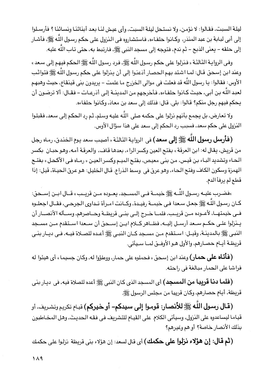 وفي الرواية الثالثة "فنزلوا على حكم رسول الله صلى الله عليه وسلم فرد رسول الله صلى الله عليه وسلم الحكم فيهم إلى سعد" وعند ابن إسحق قال: لما اشتد بهم الحصار أذعنوا إلى أن ينزلوا على حكم رسول الله صلى الله عليه وسلم فتواثب الأوس: فقالوا: يا رسول الله قد فعلت في موالي الخزرج ما علمت -يريدون بني قينقاع حيث وهبهم لعبد الله بن أبي حيث كانوا حلفاءه فأخرجهم من المدينة إلى أذرعات- فقال: ألا ترضون أن يحكم فيهم رجل منكم؟ قالوا: بلى. قال: فذلك إلى سعد بن معاذ وكانوا حلفاءه.