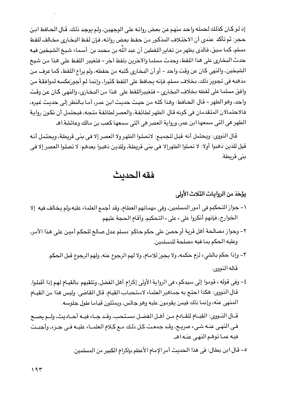 إذ لو كان كذلك لحمله واحد منهم عن بعض رواته على الوجهين ولم يوجد ذلك قال الحافظ ابن حجر: ثم تأكد عندي أن الاختلاف المذكور من حفظ بعض رواته فإن لفظ البخاري مخالف للفظ مسلم كما سبق فالذي يظهر من تغاير اللفظين أن عبد الله بن محمد بن أسماء شيخ الشيخين فيه حدث البخاري على هذا اللفظ وحدث مسلما والآخرين بلفظ آخر -فتغيير اللفظ على هذا من شيخ الشيخين والنهي كان عن وقت واحد- أو أن البخاري كتبه من حفظه ولم يراع اللفظ كما عرف من مذهبه في تجويز ذلك بخلاف مسلم فإنه يحافظ على اللفظ كثيرا وإنما لم أجوز عكسه لموافقة من وافق مسلما على لفظه بخلاف البخاري -فتغيير اللفظ على هذا من البخاري والنهي كان عن وقت واحد وهو الظهر- قال الحافظ: وهذا كله من حيث حديث ابن عمر أما بالنظر إلى حديث غيره فالاحتمالان المتقدمان في كونه قال الظهر لطائفة والعصر لطائفة متجه فيحتمل أن تكون رواية الظهر هي التي سمعها