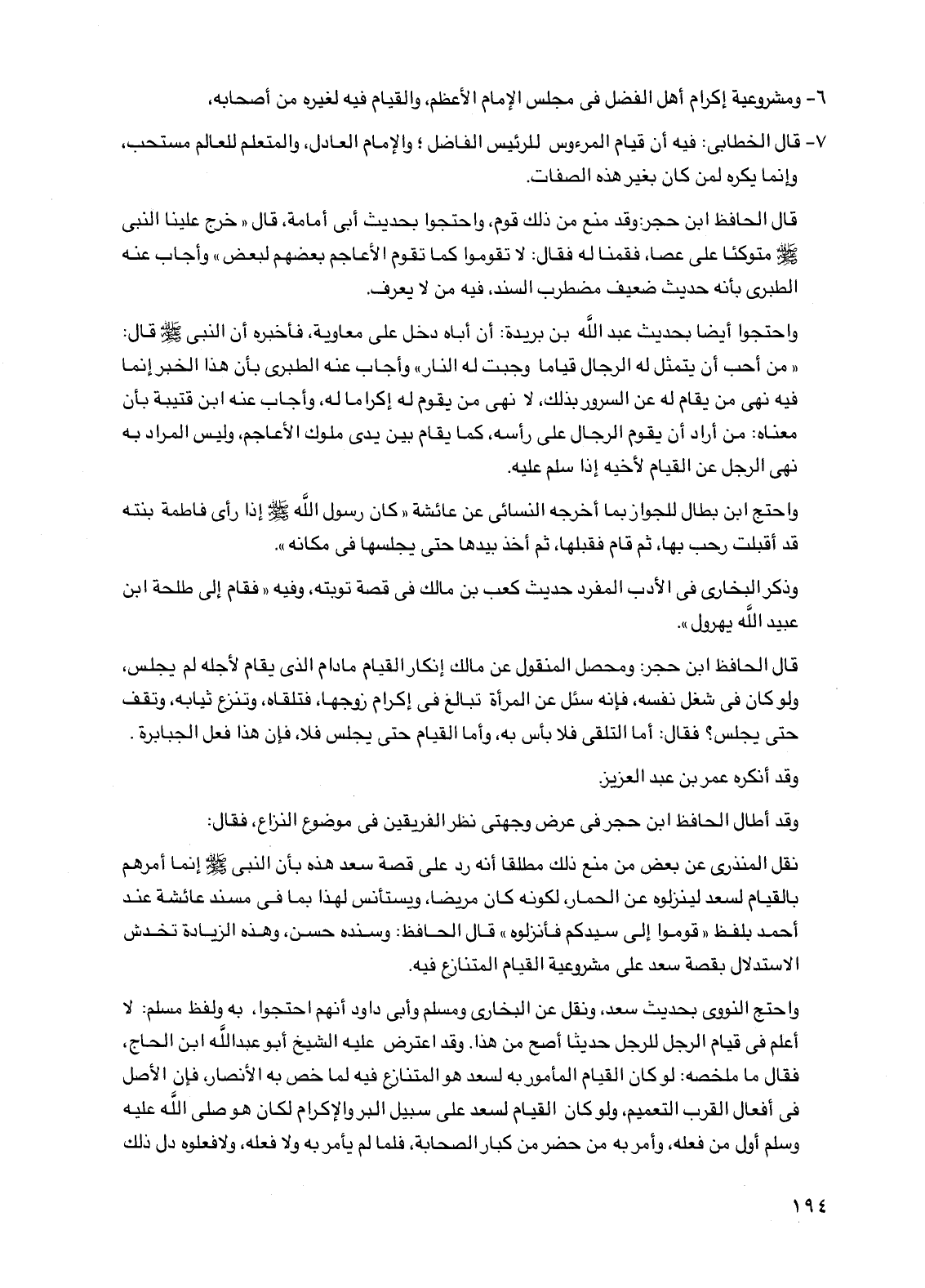 واحتج النووي بحديث سعد ونقل عن البخاري ومسلم وأبي داود أنهم احتجوا به ولفظ مسلم: لا أعلم في قيام الرجل للرجل حديثا أصح من هذا وقد اعترض عليه الشيخ أبو عبد الله ابن الحاج فقال ما ملخصه: لو كان القيام المأمور به لسعد هو المتنازع فيه لما خص به الأنصار فإن الأصل في أفعال القرب التعميم ولو كان القيام لسعد على سبيل البر والإكرام لكان هو صلى الله عليه وسلم أول من فعله وأمر به من حضر من كبار الصحابة فلما لم يأمر به ولا فعله ولا فعلوه دل ذلك