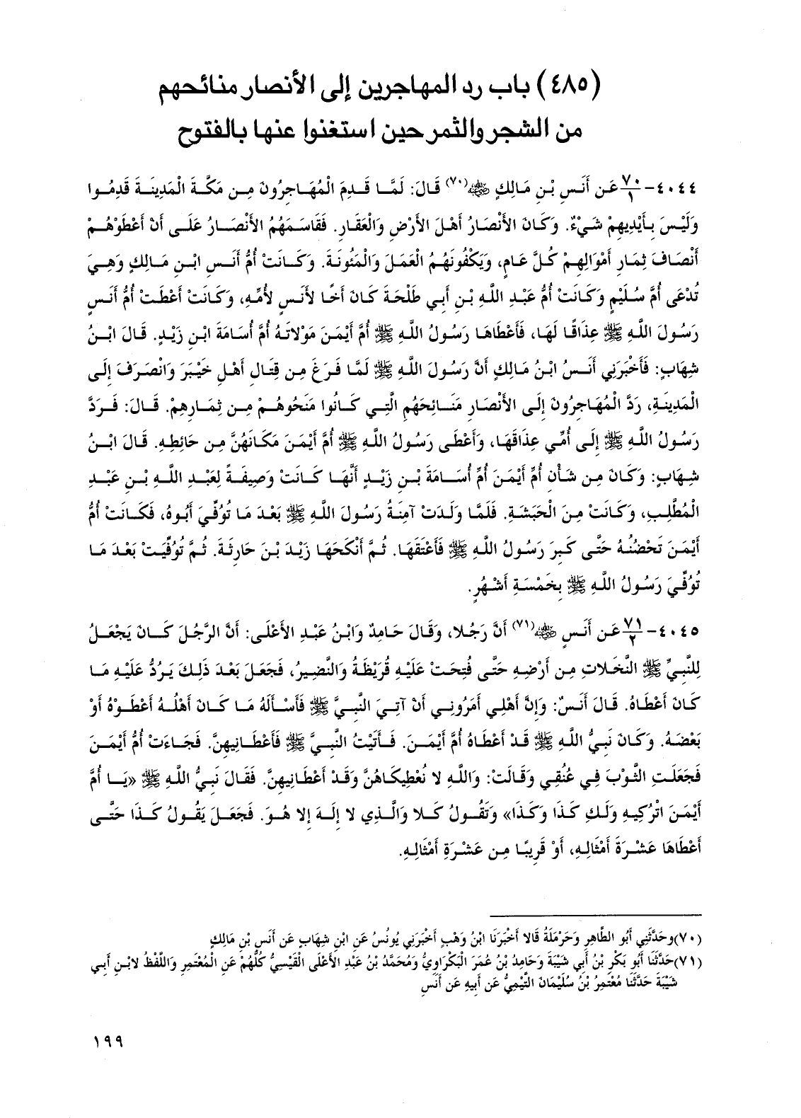 4044 - عن أنس بن مالك رضي الله عنه قال: لما قدم المهاجرون من مكة المدينة قدموا وليس بأيديهم شيء. وكان الأنصار أهل الأرض والعقار. فقاسمهم الأنصار على أن أعطوهم أنصاف ثمار أموالهم كل عام ويكفونهم العمل والمئونة. وكانت أم أنس ابن مالك وهي تدعى أم سليم وكانت أم عبد الله بن أبي طلحة كان أخا لأنس لأمه وكانت أعطت أم أنس رسول الله صلى الله عليه وسلم عذاقا لها فأعطاها رسول الله صلى الله عليه وسلم أم أيمن مولاته أم أسامة ابن زيد قال ابن شهاب: فأخبرني أنس بن مالك أن رسول الله صلى الله عليه وسلم لما فرغ من قتال أهل خيبر وانصرف إلى المدينة رد المهاجرون إلى الأنصار منائحهم التي كانوا منحوهم من ثمارهم. قال: فرد رسول الله صلى الله عليه وسلم إلى أمي عذاقها وأعطى رسول الله صلى الله عليه وسلم أم أيمن مكانهن من حائطه قال ابن شهاب: وكان من شأن أم أيمن أم أسامة بن زيد أنها كانت وصيفة لعبد الله بن عبد المطلب وكانت من الحبشة. فلما ولدت آمنة رسول الله صلى الله عليه وسلم بعد ما توفي أبوه فكانت أم أيمن تحضنه حتى كبر رسول الله صلى الله عليه وسلم فأعتقها ثم أنكحها زيد بن حارثة ثم توفيت بعد ما توفي رسول الله صلى الله عليه وسلم بخمسة أشهر.