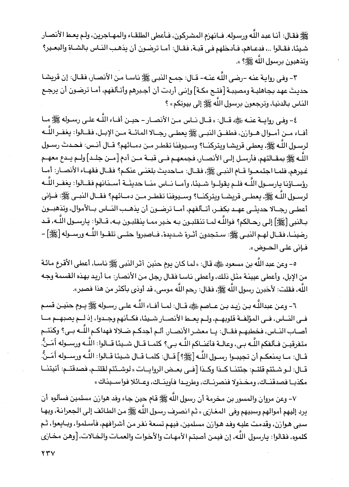 3 - وفي رواية عنه -رضي الله عنه- قال: جمع النبي صلى الله عليه وسلم ناسا من الأنصار فقال: إن قريشا حديث عهد بجاهلية ومصيبة [فتح مكة] وإني أردت أن أجبرهم وأتألفهم أما ترضون أن يرجع الناس بالدنيا وترجعون برسول الله صلى الله عليه وسلم إلى بيوتكم"؟ .