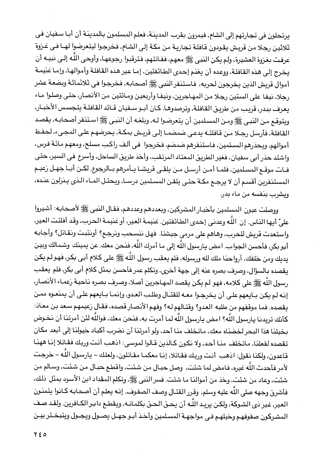 امض يا رسول الله إلى ما أمرك الله فنحن معك عن يمينك وشمالك وبين يديك ومن خلفك أرواحنا ملك لله ورسوله فلم يعقب رسول الله صلى الله عليه وسلم على كلام أبي يكر فهو لم يكن يقصده بالسؤال وصرف بصره عنه إلى جهة أخرى وتكلم عمر فأحسن بمثل كلام أبي بكر فلم يعقب رسول الله صلى الله عليه وسلم على كلامه فهو لم يكن يقصد المهاجرين أصلا وصرف بصره ناحية زعماء الأنصار إنه لم يكن بايعهم على أن يخرجوا معه للقتال وطلب العدو وإنما بايعهم على أن يمنعوه ممن يقصده فما موقفهم من طلبه العدو؟ وقتالهم له؟ وفهم الأنصار قصده فقال زعيمهم سعد بن معاذ: كأنك تريدنا يا رسول الله؟ امض يا رسول الله لما أمرت به فنحن معك فوالله لئن أمرتنا أن نخوض بخيلنا هذا البحر لخضناه معك ما تخلف منا أحد ولو أمرتنا أن نضرب أكباد خيولنا إلى أبعد مكان تقصده لفعلنا ما تخلف منا أحد ولا نكون كالذين قالوا لموسى: اذهب أنت وربك فقاتلا إنا ههنا قاعدون ولكنا نقول: اذهب أنت وربك فقاتلا إنا معكما مقاتلون ولعلك -يا رسول الله- خرجت لأمر فأحدث الله غيره فامض لما شئت وصل حبال من شئت واقطع حبال من شئت وسالم من شئت وعاد من شئت وخذ من أموالنا ما شئت فسر النبي صلى الله عليه وسلم وتكلم المقداد بن الأسود بمثل ذلك فأشرق وجهه صلى الله عليه وسلم وقرر القتال وصف الصفوف إنه يعلم أن أصحابه كانوا يتمنون العير غير ذي الشوكة ولكن يريد الله أن يحق الحق بكلماته ويقطع دابر الكافرين ولقد صف المشركون صفوفهم وخيلهم في مواجهة المسلمين وأخذ أبو جهل يصول ويجول ويتبختر بين