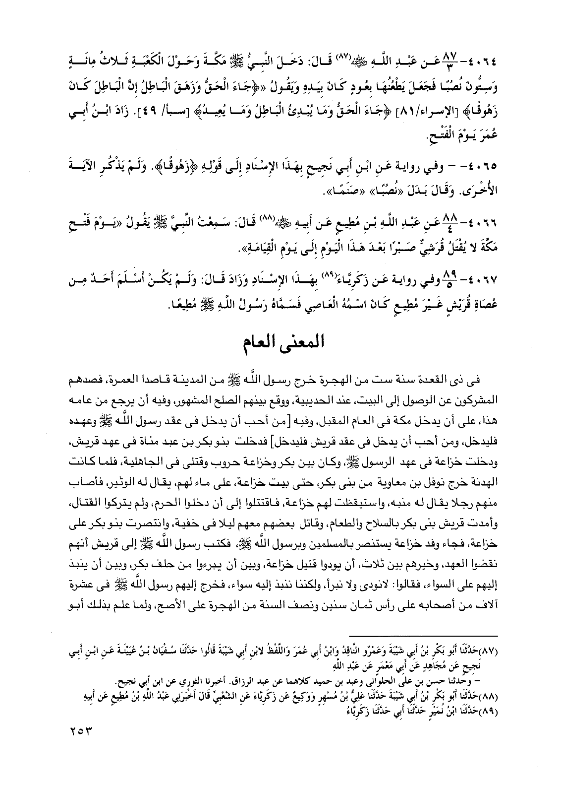 4064 - عن عبد الله رضي الله عنه قال: دخل النبي صلى الله عليه وسلم مكة وحول الكعبة ثلاث مائة وستون نصبا فجعل يطعنها بعود كان بيده ويقول {جاء الحق وزهق الباطل إن الباطل كان زهوقا} [الإسراء: 81] {جاء الحق وما يبدئ الباطل وما يعيد} [سبأ: 49]. زاد ابن أبي عمر يوم الفتح.