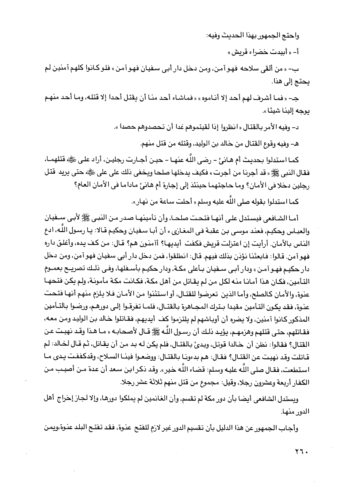 أما الشافعي فيستدل على أنها فتحت صلحا وأن تأمينها صدر من النبي صلى الله عليه وسلم لأبي سفيان والعباس وحكيم فعند موسى بن عقبة في المغازي "أن أبا سفيان وحكيم قالا: يا رسول الله ادع الناس بالأمان أرأيت إن اعتزلت قريش فكفت أيديها؟ أأمنون هم؟ قال: من كف يده وأغلق داره فهو آمن قالوا: فابعثنا نؤذن بذلك فيهم قال: انطلقوا فمن دخل دار أبي سفيان فهو آمن ومن دخل دار حكيم فهو آمن" ودار أبي سفيان بأعلى مكة ودار حكيم بأسفلها وفي ذلك تصريح بعموم التأمين فكان هذا أمانا منه لكل من لم يقاتل من أهل مكة فكانت مكة مأمونة ولم يكن فتحها عنوة والأمان كالصلح وأما الذين تعرضوا للقتال أو استثنوا من الأمان فلا يلزم منهم أنها فتحت عنوة فقد يكون التأمين مقيدا بترك المجاهرة بالقتال فلما تفرقوا إلى دورهم ورضوا بالتأمين المذكور كانوا آمنين ولا يضره أن أوباشهم لم يلتزموا كف أيديهم فقاتلوا خالد بن الوليد ومن معه فقاتلهم حتى قتلهم وهزمهم يؤيد ذلك أن رسول الله صلى الله عليه وسلم قال لأصحابه "ما هذا وقد نهيت عن القتال؟ فقالوا: نظن أن خالدا قوتل وبدئ بالقتال فلم يكن له بد من أن يقاتل ثم قال لخالد: لم قاتلت وقد نهيت عن القتال؟ فقال: هم بدءونا بالقتال: ووضعوا فينا السلاح وقد كففت يدي ما استطعت فقال صلى الله عليه وسلم: قضاء الله خير" وقد ذكر ابن سعد أن عدة من أصيب من الكفار أربعة وعشرون رجلا وقيل: مجموع من قتل منهم ثلاثة عشر رجلا.