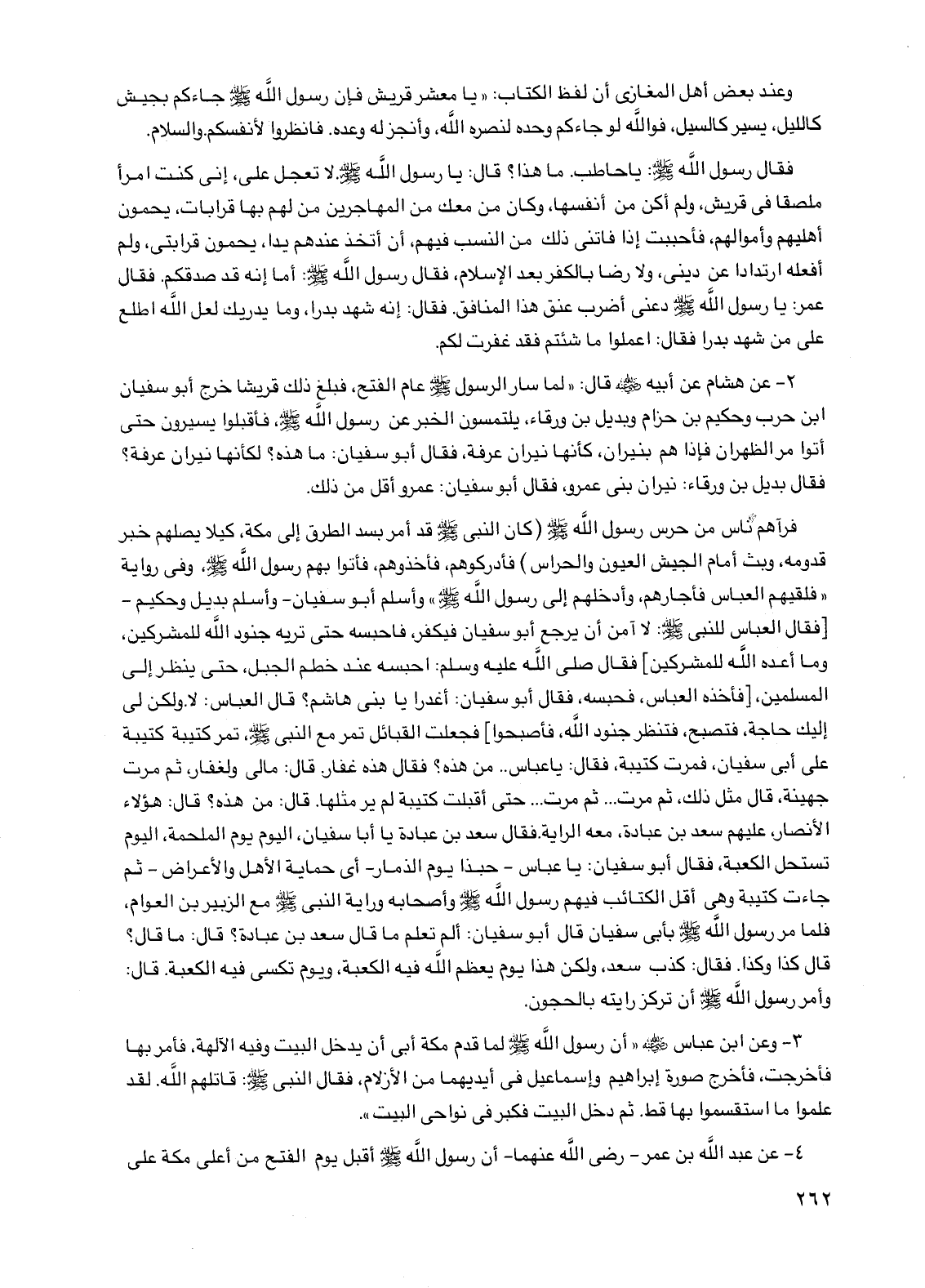 2 - عن هشام عن أبيه رضي الله عنه قال: "لما سار الرسول صلى الله عليه وسلم عام الفتح فبلغ ذلك قريشا خرج أبو سفيان بن حرب وحكيم بن حزام وبديل بن ورقاء يلتمسون الخبر عن رسول الله صلى الله عليه وسلم فأقبلوا يسيرون حتى أتوا مر الظهران فإذا هم بنيران كأنها نيران عرفة فقال أبو سفيان: ما هذه؟ لكأنها نيران عرفة؟ فقال بديل بن ورقاء: نيران بني عمرو فقال أبو سفيان: عمرو أقل من ذلك.