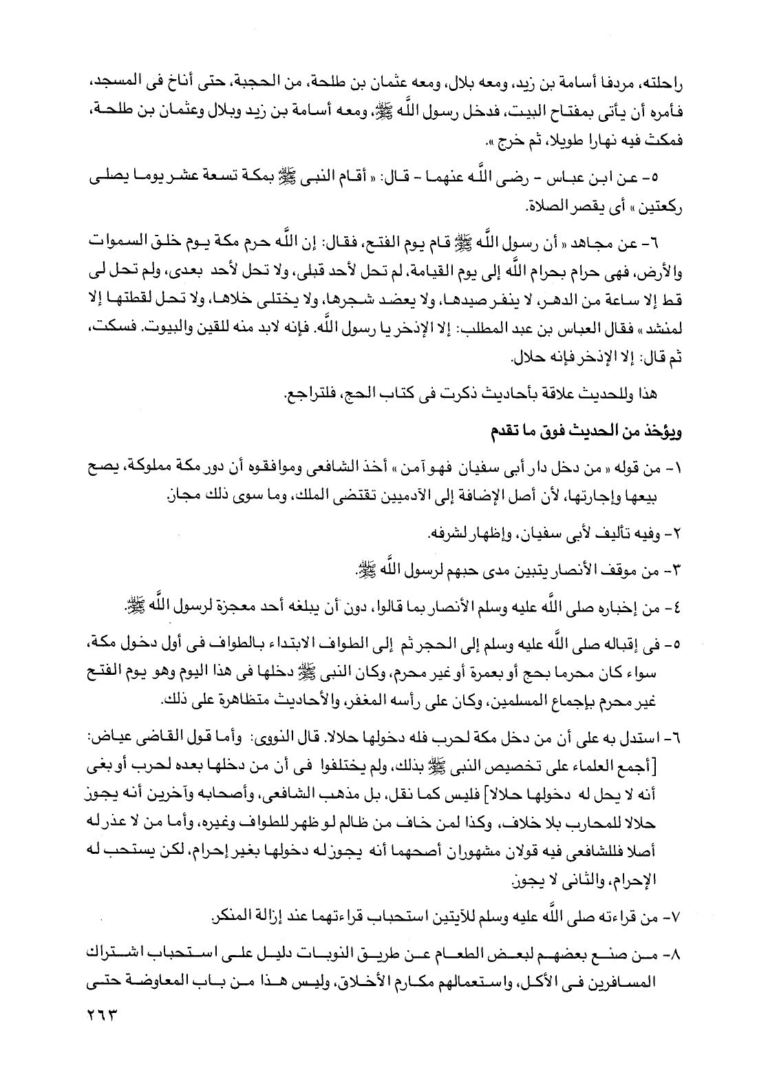1 - من قوله "من دخل دار أبي سفيان فهو آمن" أخذ الشافعي وموافقوه أن دور مكة مملوكة يصح بيعها وإجارتها لأن أصل الإضافة إلى الآدميين تقتضي الملك وما سوى ذلك مجاز.
