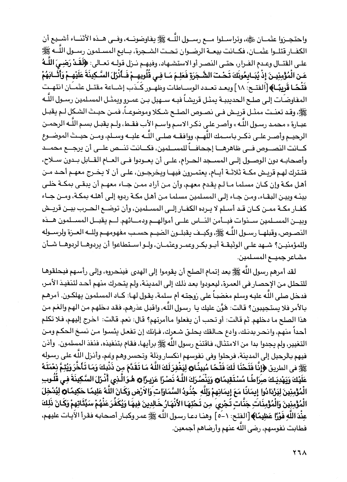 واحتجزوا عثمان رضي الله عنه وتراسلوا مع رسول الله صلى الله عليه وسلم يفاوضونه وفي هذه الأثناء أشيع أن الكفار قتلوا عثمان فكانت بيعة الرضوان تحت الشجرة بايع المسلمون رسول الله صلى الله عليه وسلم على القتال وعدم الفرار حتى النصر أو الاستشهاد وفيهم نزل قوله تعالى: {لقد رضي الله عن المؤمنين إذ يبايعونك تحت الشجرة فعلم ما في قلوبهم فأنزل السكينة عليهم وأثابهم فتحا قريبا} [الفتح: 18] وبعد تعدد الوساطات وظهور كذب إشاعة مقتل عثمان انتهت المفاوضات إلى صلح الحديبية يمثل قريشا فيه سهيل بن عمرو ويمثل المسلمين رسول الله صلى الله عليه وسلم وقد تعنت ممثل قريش في نصوص الصلح شكلا وموضوعا فمن حيث الشكل لم يقبل عبارة "محمد رسول الله" وأصر على ذكر الاسم واسم الأب فقط ولم يقبل بسم الله الرحمن الرحيم وأصر على ذكر باسمك اللهم ووافقه صلى الله عليه وسلم ومن حيث الموضوع كانت النصوص في ظاهرها إجحافا للمسلمين فكانت تنص على أن يرجع محمد وأصحابه دون الوصول إلى المسجد الحرام على أن يعودوا في العام القابل بدون سلاح فتترك لهم قريش مكة ثلاثة أيام يعتمرون فيها ويخرجون على أن لا يخرج معهم أحد من أهل مكة وإن كان مسلما ما لم يقدم معهم وأن من أراد ممن جاء معهم أن يبقى