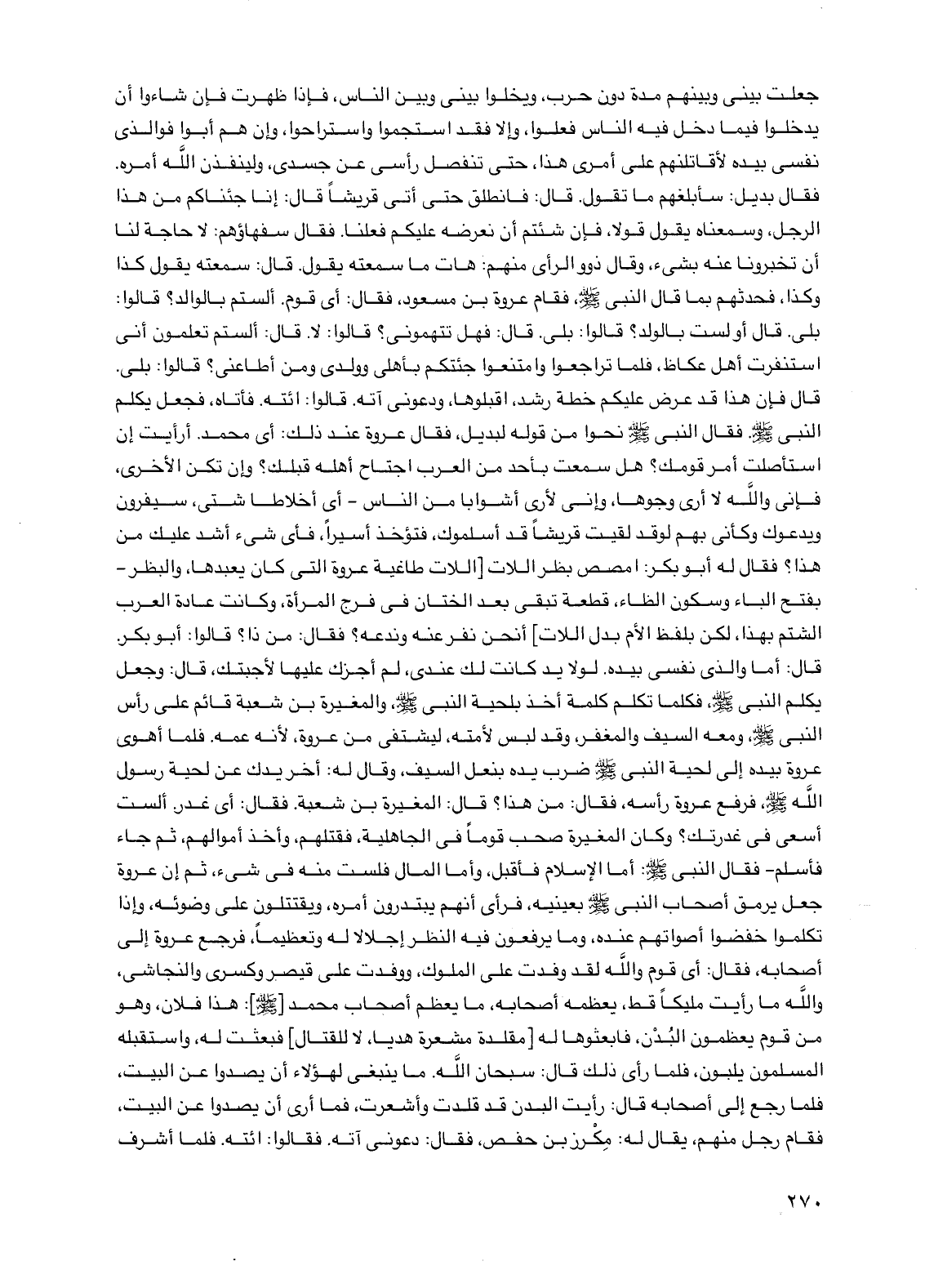 قال: ألستم تعلمون أني استنفرت أهل عكاظ فلما تراجعوا وامتنعوا جئتكم بأهلي وولدي ومن أطاعني؟ قالوا: بلى قال فإن هذا قد عرض عليكم خطة رشد اقبلوها ودعوني آته قالوا: ائته فأتاه فجعل يكلم النبي صلى الله عليه وسلم فقال النبي صلى الله عليه وسلم نحوا من قوله لبديل فقال عروة عند ذلك: أي محمد أرأيت إن استأصلت أمر قومك؟ هل سمعت بأحد من العرب اجتاح أهله قبلك؟ وإن تكن الأخرى فإني والله لا أرى وجوها وإني لأرى أشوابا من الناس -أي أخلاطا شتى سيفرون ويدعوك وكأني بهم لوقد لقيت قريشا قد أسلموك فتؤخذ أسيرا فأي شيء أشد عليك من هذا؟ فقال له أبو بكر: امصص بظر اللات [اللات طاغية عروة التي كان يعبدها والبظر -بفتح الباء وسكون الظاء قطعة تبقى بعد الختان في فرج المرأة وكانت عادة العرب الشتم بهذا لكن بلفظ الأم بدل اللات] أنحن نفر عنه وندعه؟ فقال: من ذا؟ قالوا: أبو بكر قال: أما والذي نفسي بيده لولا يد كانت لك عندي لم أجزك عليها لأجبتك قال: وجعل يكلم النبي صلى الله عليه وسلم فكلما تكلم كلمة أخذ بلحية النبي صلى الله عليه وسلم والمغيرة بن شعبة قائم على رأس النبي صلى الله عليه وسلم ومعه السيف والمغفر وقد لبس لأمته ليشتفي من عروة لأنه عمه فلما أهوى عروة بيده إلى لحية النبي صلى الله عليه وسلم ضرب يده بنعل السيف وقال له: أخر يدك عن لحية رسول الله صلى الله عليه وسلم فرفع عروة رأسه فقال: من هذا؟ قال: المغيرة بن شعبة فقال: أي غدر ألست أسعى في غدرتك؟ وكان المغيرة صحب قوما في الجاهلية فقتلهم وأخذ أموالهم ثم جاء فأسلم -فقال النبي صلى الله عليه وسلم: أما الإسلام فأقبل وأما المال فلست منه في شيء ثم إن عروة جعل يرمق أصحاب النبي صلى الله عليه وسلم بعينيه فرأى أنهم يبتدرون أمره ويقتتلون على وضوئه وإذا تكلموا خفضوا أصواتهم عنده وما يرفعون فيه النظر إجلالا له وتعظيما فرجع عروة إلى أصحابه فقال: أي قوم والله لقد وفدت على