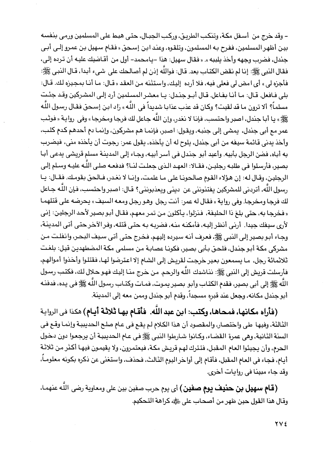 قال: بلى فافعل قال: ما أنا بفاعل قال أبو جندل: يا معشر المسلمين أرد إلى المشركين وقد جئت مسلما؟ ألا ترون ما قد لقيت؟ وكان قد عذب عذابا شديدا في الله"، زاد ابن إسحق فقال رسول الله صلى الله عليه وسلم" يا أبا جندل اصبر واحتسب فإنا لا نغدر وإن الله جاعل لك فرجا ومخرجا" وفي رواية "فوثب عمر مع أبي جندل يمشي إلى جنبه ويقول: اصبر فإنما هم مشركون وإنما دم أحدهم كدم كلب وأخذ يدني قائمة سيفه من أبي جندل يلوح له أن يأخذه يقول عمر: رجوت أن يأخذه مني فيضرب به أباه فضن الرجل بأبيه وأعيد أبو جندل في أسر أبيه وجاء إلى المدينة مسلم قريشي يدعى أبا بصير فأرسلوا في طلبه رجلين فقالا: العهد الذي جعلت لنا؟ فدفعه صلى الله عليه وسلم إلى الرجلين وقال له: إن هؤلاء القوم صالحونا على ما علمت وإنا لا نغدر فالحق بقومك فقال: يا رسول الله أتردني للمشركين يفتنونني عن ديني ويعذبونني؟ قال: اصبر واحتسب فإن الله جاعل لك فرجا ومخرجا وفي رواية "فقال له عمر: أنت رجل وهو رجل ومعه السيف" يحرضه على قتلهما "فخرجا به حتى بلغ ذا الحليفة فنزلوا يأكلون من تمر معهم فقال أبو بصير لأحد الرجلين: إني لأرى سيفك جيدا أرني أنظر إليه فأمكنه منه فضربه به حتى قتله وفر الآخر حتى أتى المدينة وجاء أبو بصير إلى النبي صلى الله عليه وسلم فعرف أنه سيرده إليهم فخرج حتى أتى سيف البحر وانفلت من مشركي مكة أبو جندل فلحق بأبي بصير فكونا عصابة من مسلمي مكة المضطهدين قيل: بلغت ثلاثمائة رجل ما يسمعون بعير خرجت لقريش إلى الشام إلا اعترضوا لها فقتلوا وأخذوا أموالهم فأرسلت قريش إلى النبي صلى الله عليه وسلم: نناشدك الله والرحم من خرج منا إليك فهو حلال لك فكتب رسول الله صلى الله عليه وسلم إلى أبي بصير فقدم الكتاب وأبو بصير يموت فمات وكتاب رسول الله صلى الله عليه وسلم في يده فدفنه أبو جندل مكانه وجعل عند قبره مسجدا وقدم أبو جندل وممن معه إلى المدينة.