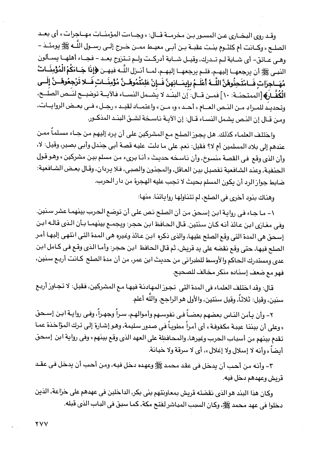 وقد روى البخاري عن المسور بن مخرمة قال: "وجاءت المؤمنات مهاجرات" أي بعد الصلح "وكانت أم كلثوم بنت عقبة بن أبي معيط ممن خرج إلى رسول الله صلى الله عليه وسلم يومئذ -وهي عاتق- أي شابة لم تدرك وقيل شابة أدركت ولم تتزوج بعد -فجاء أهلها يسألون النبي صلى الله عليه وسلم أن يرجعها إليهم فلم يرجعها إليهم لما أنزل الله فيهن {إذا جاءكم المؤمنات مهاجرات فامتحنوهن الله أعلم بإيمانهن فإن علمتموهن مؤمنات فلا ترجعوهن إلى الكفار} [الممتحنة: 10] فمن قال: إن البند لا يشمل النساء فالآية توضيح لنص الصلح وتحديد للمراد من النص العام "أحد" و"من" واعتماد لقيد "رجل" في بعض الروايات ومن قال إن النص يشمل النساء قال: إن الآية ناسخة لشق البند المذكور.