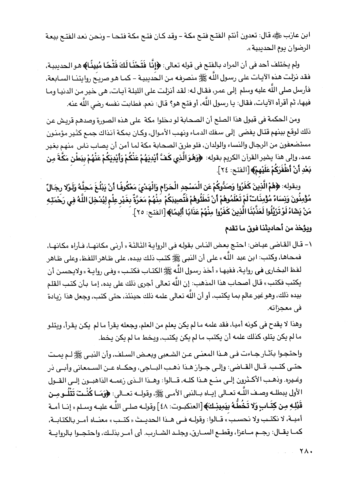 ولم يختلف أحد في أن المراد بالفتح في قوله تعالى: {إنا فتحنا لك فتحا مبينا} هو الحديبية فقد نزلت هذه الآيات على رسول الله صلى الله عليه وسلم منصرفه من الحديبية -كما هو صريح روايتنا السابعة فأرسل صلى الله عليه وسلم إلى عمر فقال له: لقد أنزلت على الليلة آيات هي خير من الدنيا وما فيها ثم أقرأه الآيات فقال: يا رسول الله أو فتح هو؟ قال: نعم فطابت نفسه رضي الله عنه.