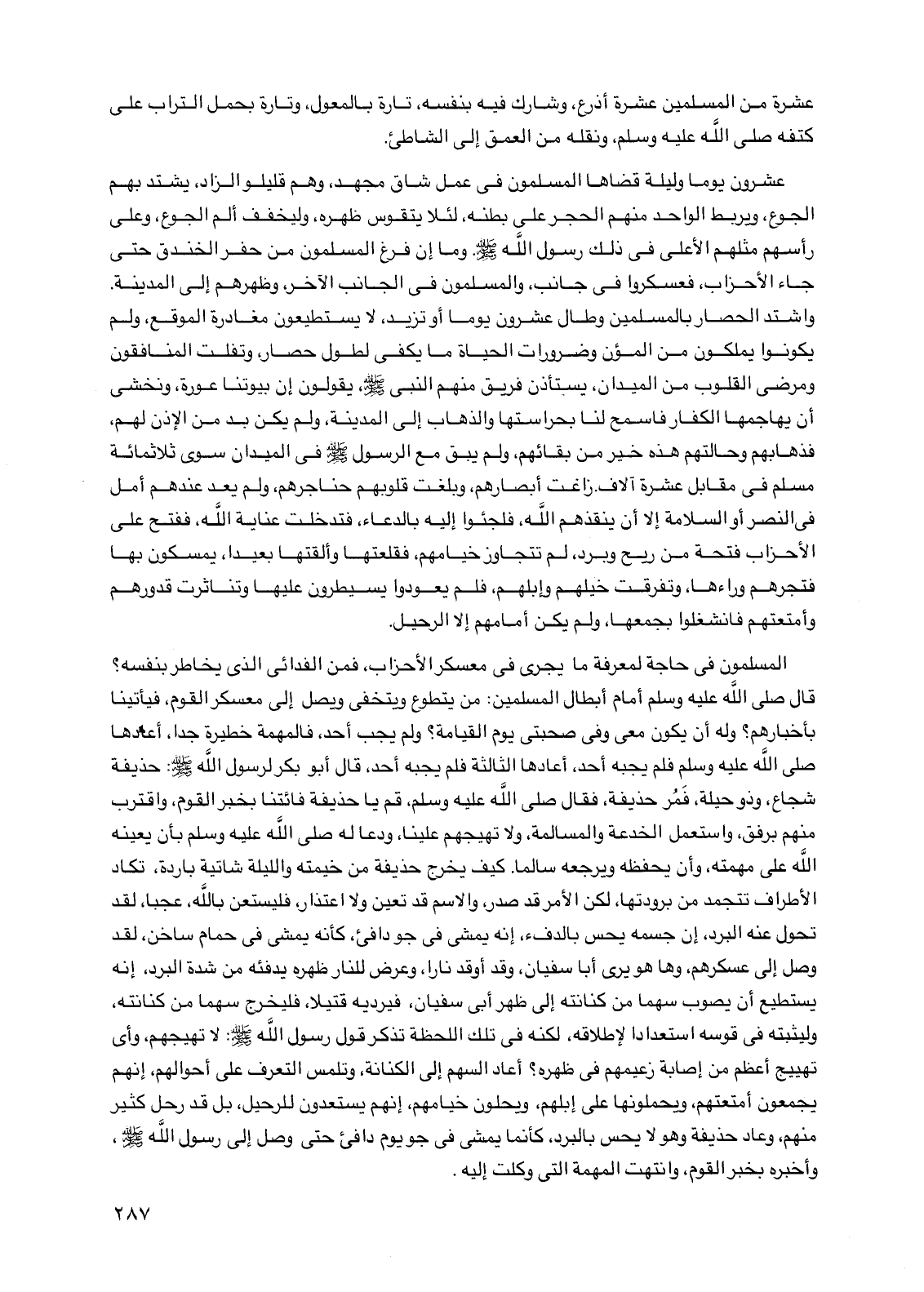 عشرة من المسلمين عشرة أذرع وشارك فيه بنفسه تارة بالمعول وتارة بحمل التراب على كتفه صلى الله عليه وسلم ونقله من العمق إلى الشاطئ.