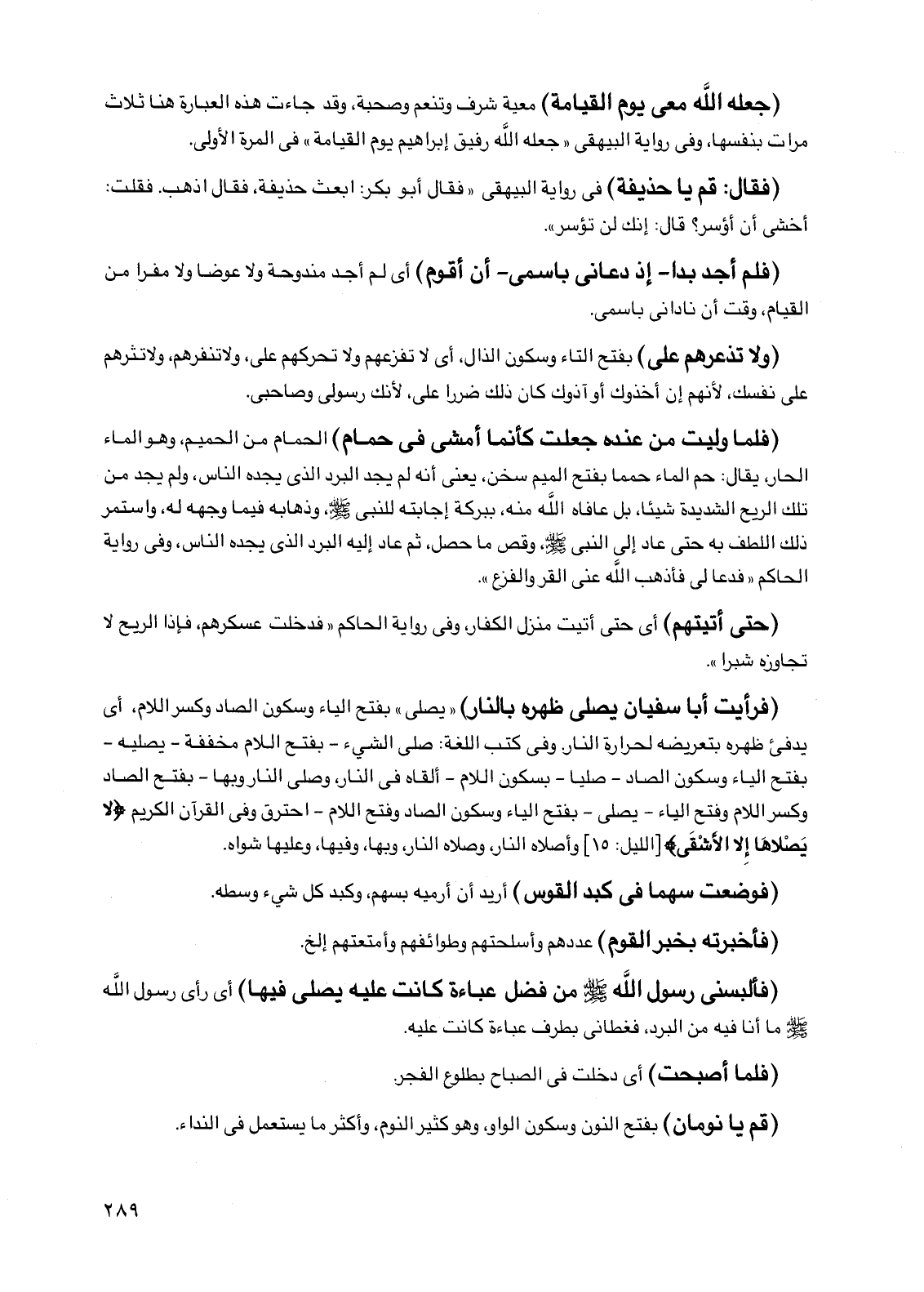 (فرأيت أبا سفيان يصلي ظهره بالنار) "يصلي" بفتح الياء وسكون الصاد وكسر اللام أي يدفئ ظهره بتعريضه لحرارة النار وفي كتب اللغة: صلى الشيء -بفتح اللام مخففة- يصليه -بفتح الياء وسكون الصاد- صليا -بسكون اللام- ألقاه في النار وصلى النار وبها -بفتح الصاد وكسر اللام وفتح الياء- يصلى -بفتح الياء وسكون الصاد وفتح اللام- احترق وفي القرآن الكريم {لا يصلاها إلا الأشقى} [الليل: 15] وأصلاه النار وصلاه النار وبها وفيها وعليها شواه.