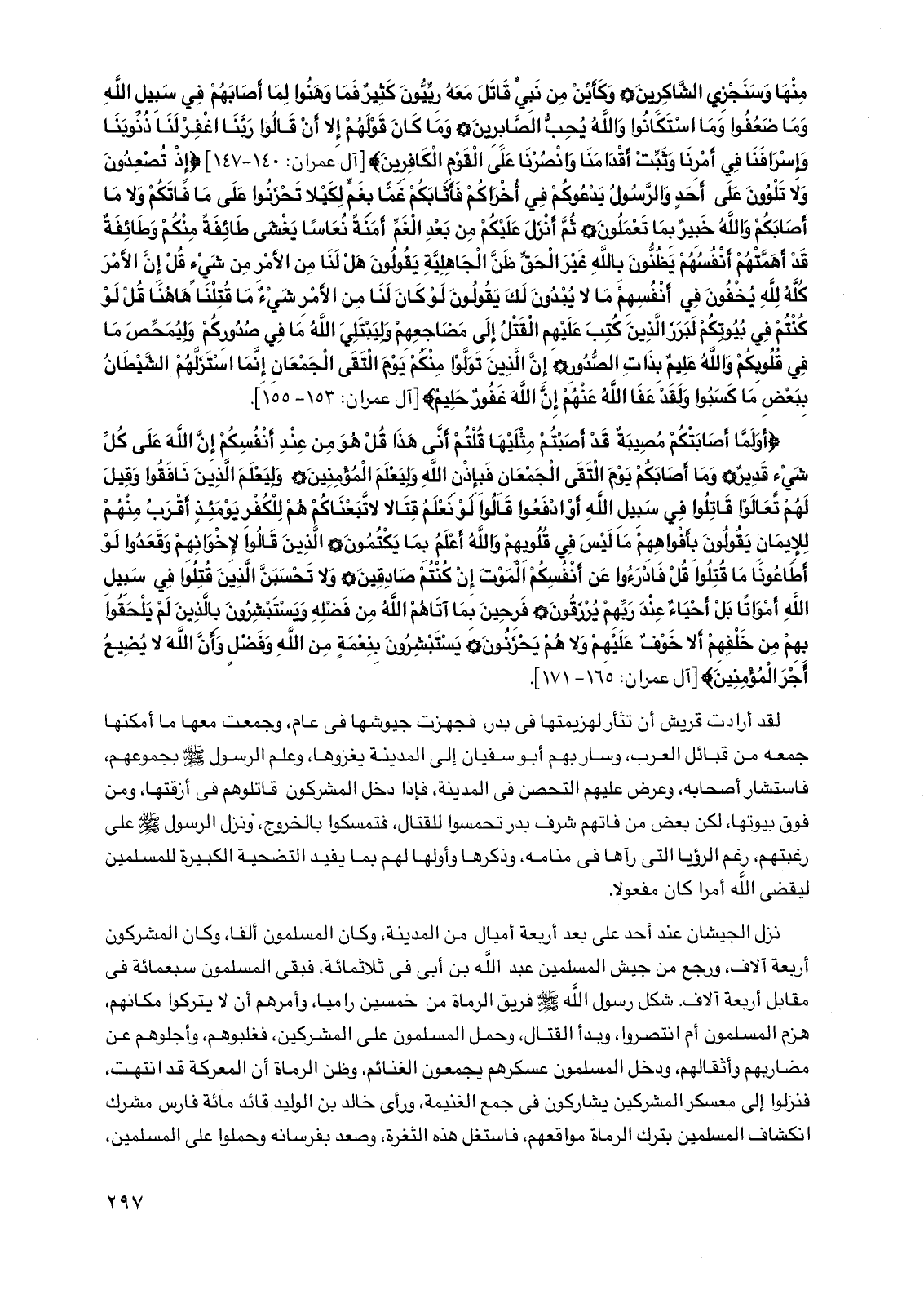 منها وسنجزي الشاكرين* وكأين من نبي قاتل معه ربيون كثير فما وهنوا لما أصابهم في سبيل الله وما ضعفوا وما استكانوا والله يحب الصابرين* وما كان قولهم إلا أن قالوا ربنا اغفر لنا ذنوبنا وإسرافنا في أمرنا وثبت أقدامنا وانصرنا على القوم الكافرين} [آل عمران: 140 - 147] {إذ تصعدون ولا تلوون على أحد والرسول يدعوكم في أخراكم فأثابكم غما بغم لكيلا تحزنوا على ما فاتكم ولا ما أصابكم والله خبير بما تعملون* ثم أنزل عليكم من بعد الغم أمنة نعاسا يغشى طائفة منكم وطائفة قد أهمتهم أنفسهم يظنون بالله غير الحق ظن الجاهلية يقولون هل لنا من الأمر من شيء قل إن الأمر كله لله يخفون في أنفسهم ما لا يبدون لك يقولون لو كان لنا من الأمر شيء ما قتلنا هاهنا قل لو كنتم في بيوتكم لبرز الذين كتب عليهم القتل إلى مضاجعهم وليبتلي الله ما في صدوركم وليمحص ما في قلوبكم والله عليم بذات الصدور* إن الذين تولوا منكم يوم التقى الجمعان إنما استزلهم الشيطان ببعض ما كسبوا ولقد عفا الله عنهم إن الله غفور حليم} [آل عمران: 153 -