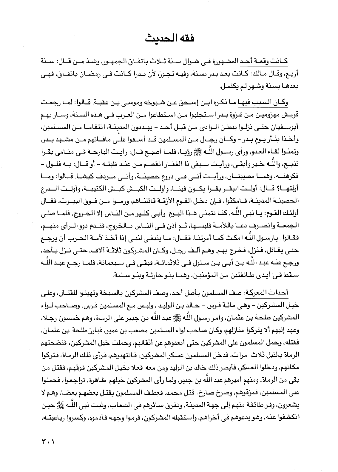 أحداث المعركة: صف المسلمون بأصل أحد وصف المشركون بالسبخة وتهيئوا للقتال وعلى خيل المشركين -وهي مائة فرس- خالد بن الوليد وليس مع المسلمين فرس وصاحب لواء المشركين طلحة بن عثمان وأمر رسول الله صلى الله عليه وسلم عبد الله بن جبير على الرماة وهم خمسون رجلا وعهد إليهم ألا يتركوا منازلهم وكان صاحب لواء المسلمين مصعب بن عمير فبارز طلحة بن عثمان فقتله وحمل المسلمون على المشركين حتى أبعدوهم عن أثقالهم وحملت خيل المشركين فنضحتهم الرماة بالنبل ثلاث مرات فدخل المسلمون عسكر المشركين فانتهبوهم فرأى ذلك الرماة فتركوا مكانهم ودخلوا العسكر فأبصر ذلك خالد بن الوليد ومن معه فعلا بخيل المشركين فوقهم فقتل من بقي من الرماة ومنهم أميرهم عبد الله بن جبير ولما رأى المشركون خيلهم ظاهرة تراجعوا فحملوا على المسلمين فمزقوهم وصرخ صارخ: قتل محمد فعطف المسلمون يقتل بعضهم بعضا وهم لا يشعرون وفر طائفة منهم إلى جهة المدينة وتفرق سائرهم في الشعاب وثبت نبي الله صلى الله عليه وسلم حين انكشفوا عنه وهو يدعوهم في أخراهم واستقبله المشركون فرموا وجهه فأدموه وكسروا رباعيته