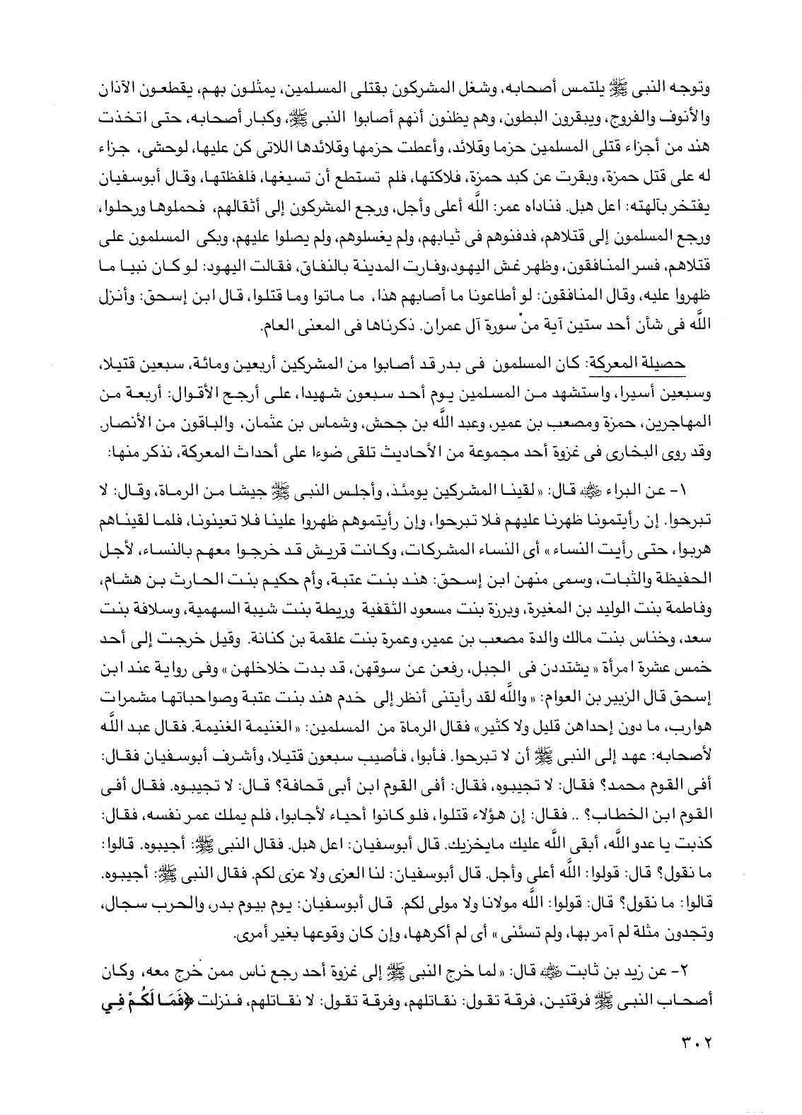 1 - عن البراء رضي الله عنه قال: "لقينا المشركين يومئذ وأجلس النبي صلى الله عليه وسلم جيشا من الرماة وقال: لا تبرحوا إن رأيتمونا ظهرنا عليهم فلا تبرحوا وإن رأيتموهم ظهروا علينا فلا تعينونا فلما لقيناهم هربوا حتى رأيت النساء" أي النساء المشركات وكانت قريش قد خرجوا معهم بالنساء لأجل الحفيظة والثبات وسمي منهن ابن إسحق: هند بنت عتبة وأم حكيم بنت الحارث بن هشام وفاطمة بنت الوليد بن المغيرة وبرزة بنت مسعود الثقفية وريطة بنت شيبة السهمية وسلافة بنت سعد وخناس بنت مالك والدة مصعب بن عمير وعمرة بنت علقمة بن كنانة وقيل خرجت إلى أحد خمس عشرة امرأة "يشتددن في الجبل رفعن عن سوقهن قد بدت خلاخلهن" وفي رواية عند ابن إسحق قال الزبير بن العوام: "والله لقد رأيتني أنظر إلى خدم هند بنت عتبة وصواحباتها مشمرات هوارب ما دون إحداهن قليل ولا كثير" فقال الرماة من المسلمين: "الغنيمة الغنيمة. فقال عبد الله لأصحابه: عهد إلي النبي صلى الله عليه وسلم أن لا تبرحوا فأبوا فأصيب سبعون قتيلا وأشرف أبو سفيان فقال: أفي القوم محمد؟ فقال: لا تجيبوه فقال: أفي القوم ابن أبي قحافة؟ قال: لا تجيبوه فقال أفي القوم ابن الخطاب؟ .. فقال: إن هؤلاء قتلوا فلو كانوا أحياء لأجابوا فلم يملك عمر نفسه فقال: كذبت يا عدو الله أبقى الله عليك ما يخزيك. قال أبو سفيان: اعل هبل فقال النبي صلى الله عليه وسلم: أجيبوه. قالوا: ما نقول؟ قال: قولوا: الله أعلى وأجل قال أبو سفيان: لنا العزى ولا عزى لكم فقال النبي صلى الله عليه وسلم: أجيبوه قالوا: ما نقول؟ قال: قالوا: الله مولانا ولا مولى لكم. قال أبو سفيان: يوم بيوم بدر والحرب سجال وتجدون مثلة لم آمر بها ولم تسئني" أي لم أكرهها وإن كان وقوعها بغير أمري.