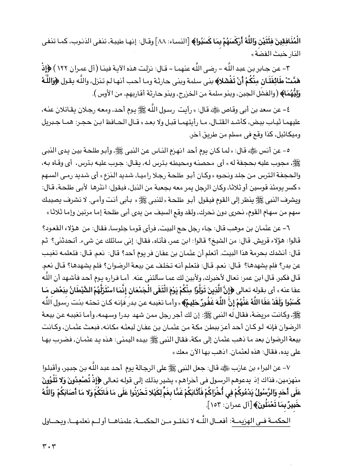 7 - عن البراء بن عازب رضي الله عنه قال: جعل النبي صلى الله عليه وسلم على الرجالة يوم أحد عبد الله بن جبير وأقبلوا منهزمين فذاك إذ يدعوهم الرسول في أخراهم" يشير بذلك إلى قوله تعالى {إذ تصعدون ولا تلوون على أحد والرسول يدعوكم في أخراكم فأثابكم غما بغم لكيلا تحزنوا على ما فاتكم ولا ما أصابكم والله خبير بما تعملون} [آل عمران: 135].