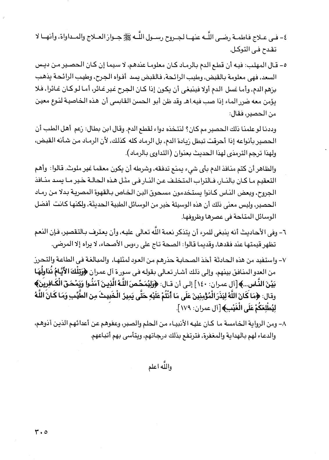وددنا لو علمنا ذلك الحصير مم كان؟ لنتخذه دواء لقطع الدم وقال ابن بطال: زعم أهل الطب أن الحصير بأنواعه إذا أحرقت تبطل زيادة الدم بل الرماد كله كذلك لأن الرماد من شأنه القبض ولهذا ترجم الترمذي لهذا الحديث بعنوان (التداوي بالرماد).