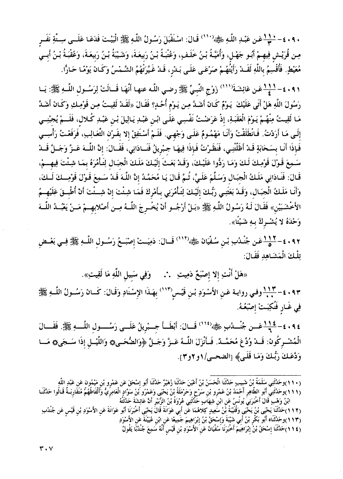 4094 - عن جندب رضي الله عنه قال: أبطأ جبريل على رسول الله صلى الله عليه وسلم فقال المشركون: قد ودع محمد فأنزل الله عز وجل {والضحى* والليل إذا سجى* ما ودعك ربك وما قلى} [الضحى: 1 و 2 و 3].
