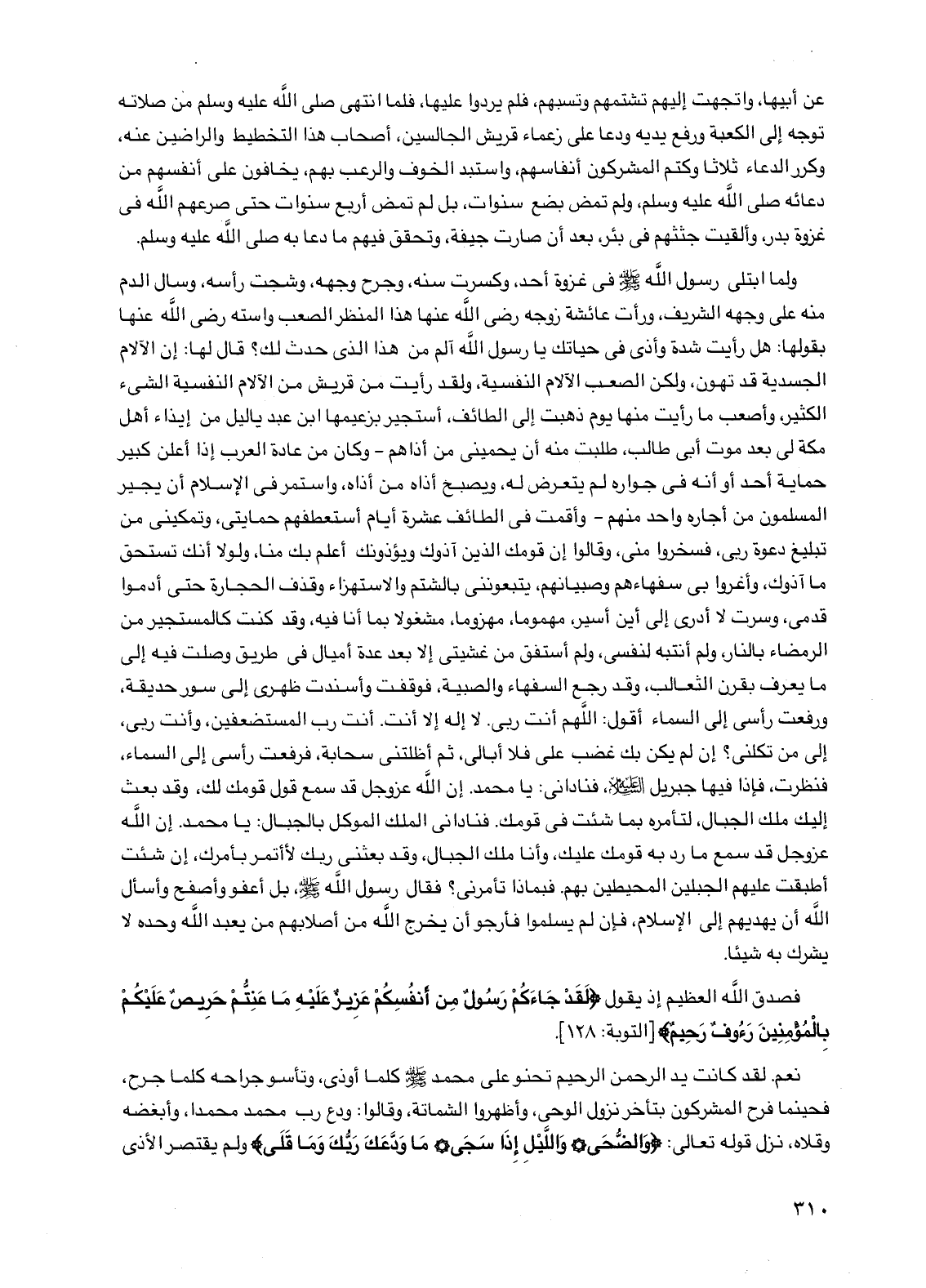 ولما ابتلى رسول الله صلى الله عليه وسلم في غزوة أحد وكسرت سنه وجرح وجهه وشجت رأسه وسال الدم منه على وجهه الشريف ورأت عائشة زوجه رضي الله عنها هذا المنظر الصعب واسته رضي الله عنها بقولها: هل رأيت شدة وأذى في حياتك يا رسول الله آلم من هذا الذي حدث لك؟ قال لها: إن الآلام الجسدية قد تهون ولكن الصعب الآلام النفسية ولقد رأيت من قريش من الآلام النفسية الشيء الكثير وأصعب ما رأيت منها يوم ذهبت إلى الطائف أستجير بزعيمها ابن عبد ياليل من إيذاء أهل مكة لي بعد موت أبي طالب طلبت منه أن يحميني من أذاهم -وكان من عادة العرب إذا أعلن كبير حماية أحد أو أنه في جواره لم يتعرض له ويصبح أذاه من أذاه واستمر في الإسلام أن يجير المسلمون من أجاره واحد منهم- وأقمت في الطائف عشر أيام أستعطفهم حمايتي وتمكيني من تبليغ دعوة ربي فسخروا مني وقالوا إن قومك الذين آذوك ويؤذونك أعلم بك منا ولولا أنك تستحق ما آذوك وأغروا بي سفهاءهم وصبيانهم يتبعونني بالشتم والاستهزاء وقذف الحجارة حتى أدموا قدمي وسرت لا أدري إلى أين أسير مهموما مهزوما مشغولا بما أنا فيه وقد كنت كالمستجير من الرمضاء بالنار ولم أنتبه لنفسي ولم أستفق من غشيتي إلا بعد عدة أميال في طريق وصلت فيه إلى ما يعرف بقرن الثعالب وقد رجع السفهاء والصبية فوقفت وأسندت ظهري إلى سور حديقة ورفعت رأسي إلى السماء أقول: اللهم أنت ربي لا إله إلا أنت أنت رب المستضعفين وأنت ربي إلى من تكلني؟ إن لم يكن بك غضب علي فلا أبالي ثم أظلتني سحابة فرفعت رأسي إلى السماء فنظرت فإذا فيها جبريل عليه السلام فناداني: يا محمد إن الله عز وجل قد سمع قول قومك لك وقد بعث إليك ملك الجبال لتأمره بما شئت في قومك فناداني الملك الموكل بالجبال: يا محمد إن الله عز وجل قد سمع ما رد به قومك عليك وأنا ملك الجبال وقد بعثني ربك لأأتمر بأمرك إن شئت أطبقت عليهم الجبلين المحيطين بهم فبماذا تأمرني؟ فقال