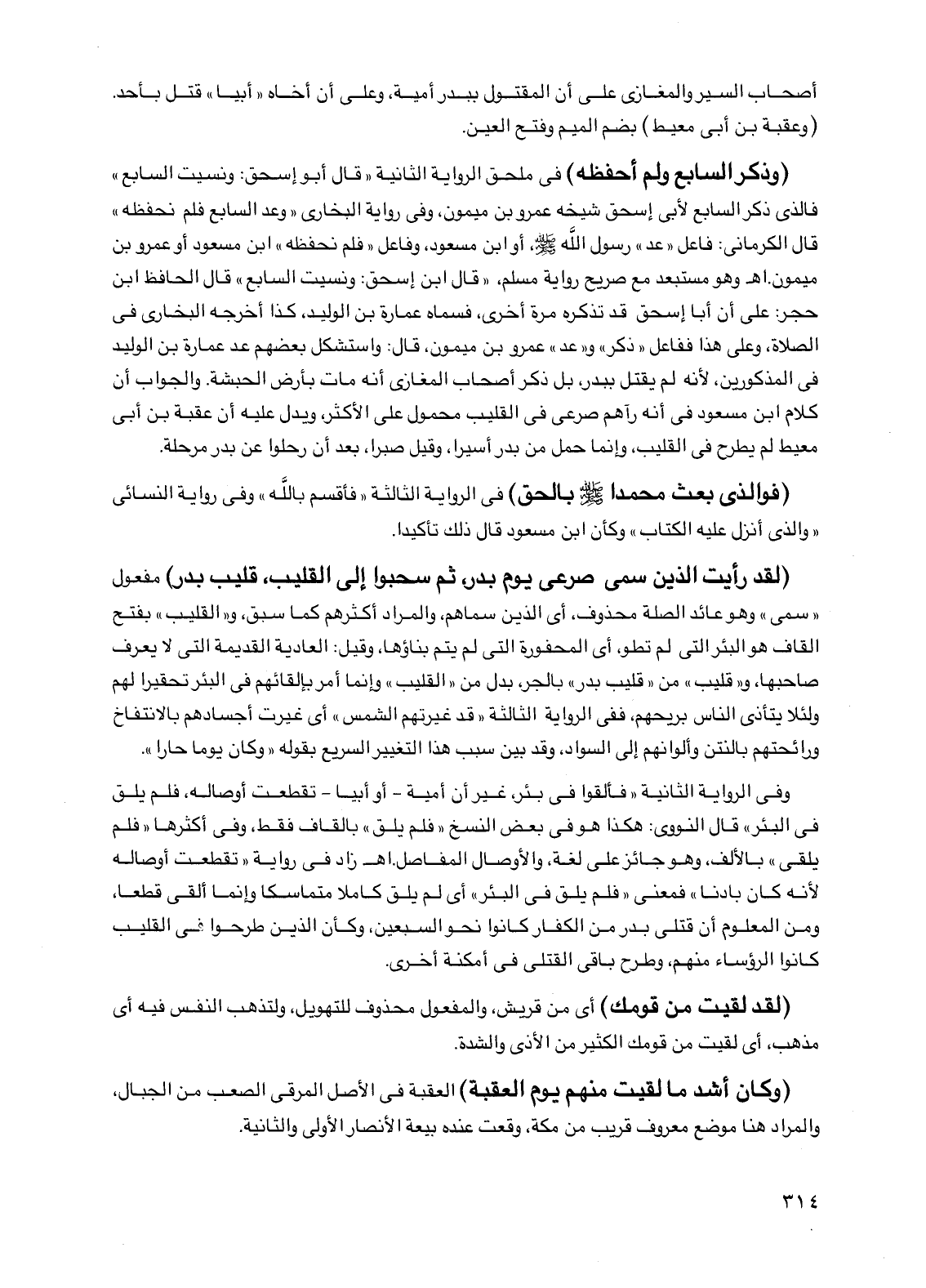 (لقد رأيت الذين سمى صرعى يوم بدر ثم سحبوا إلى القليب قليب بدر) مفعول "سمى" وهو عائد الصلة محذوف أي الذين سماهم والمراد أكثرهم كما سبق و"القليب" بفتح القاف هو البئر التي لم تطو أي المحفورة التي لم يتم بناؤها وقيل: العادية القديمة التي لا يعرف صاحبها و"قليب" من "قليب بدر" بالجر بدل من "القليب" وإنما أمر بإلقائهم في البئر تحقيرا لهم ولئلا يتأذى الناس بريحهم ففي الرواية الثالثة "قد غيرتهم الشمس" أي غيرت أجسادهم بالانتفاخ ورائحتهم بالنتن وألوانهم إلى السواد وقد بين سبب هذا التغيير السريع بقوله "وكان يوما حارا".