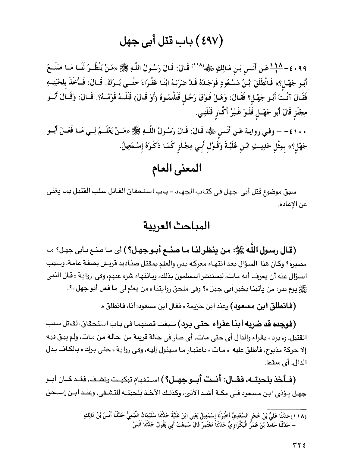 (قال رسول الله صلى الله عليه وسلم: من ينظر لنا ما صنع أبو جهل؟ ) أي ما صنع بأبي جهل؟ ما مصيره؟ وكان هذا السؤال بعد انتهاء معركة بدر والعلم بمقتل صناديد قريش بصفة عامة وسبب السؤال عنه أن يعرف أنه مات ليستبشر المسلمون بذلك وبانتهاء شره عنهم وفي رواية "قال النبي صلى الله عليه وسلم يوم بدر: من يأتينا بخبر أبي جهل"؟ وفي ملحق روايتنا "من يعلم لي ما فعل أبو جهل"؟ .