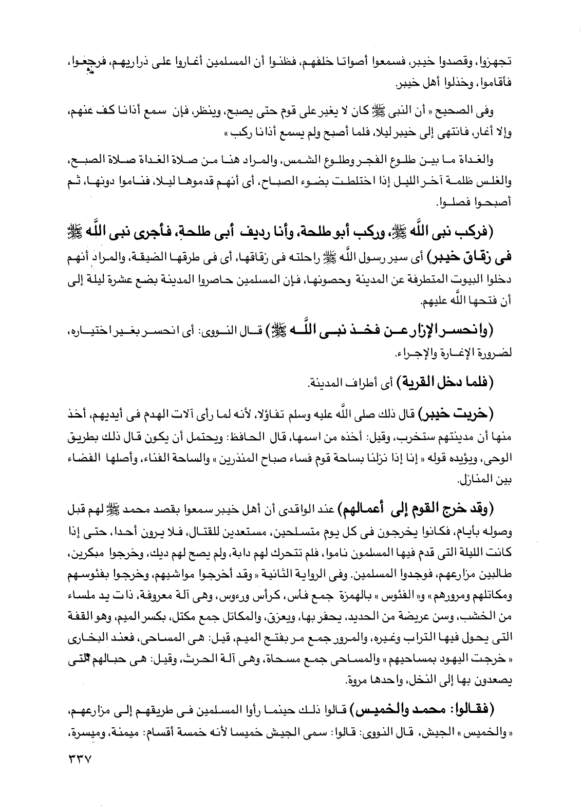 (وقد خرج القوم إلى أعمالهم) عند الواقدي أن أهل خيبر سمعوا بقصد محمد صلى الله عليه وسلم لهم قبل وصوله بأيام، فكانوا يخرجون في كل يوم متسلحين، مستعدين للقتال، فلا يرون أحدا، حتى إذا كانت الليلة التي قدم فيها المسلمون ناموا، فلم تتحرك لهم دابة، ولم يصح لهم ديك، وخرجوا مبكرين، طالبين مزارعهم، فوجدوا المسلمين. وفي الرواية الثانية "وقد أخرجوا مواشيهم، وخرجوا بفئوسهم ومكاتلهم ومرورهم" و"الفئوس" بالهمزة جمع فأس، كرأس ورءوس، وهي آلة معروفة، ذات يد ملساء من الخشب، وسن عريضة من الحديد، يحفر بها، ويعزق، والمكاتل جمع مكتل، بكسر الميم، وهو القفة التي يحول فيها التراب وغيره، والمرور جمع مر بفتح الميم، قيل: هي المساحي، فعند البخاري "خرجت اليهود بمساحيهم" والمساحي جمع مسحاة، وهي آلة الحرث، وقيل: هي حبالهم التي يصعدون بها إلى النخل، واحدها مروة.