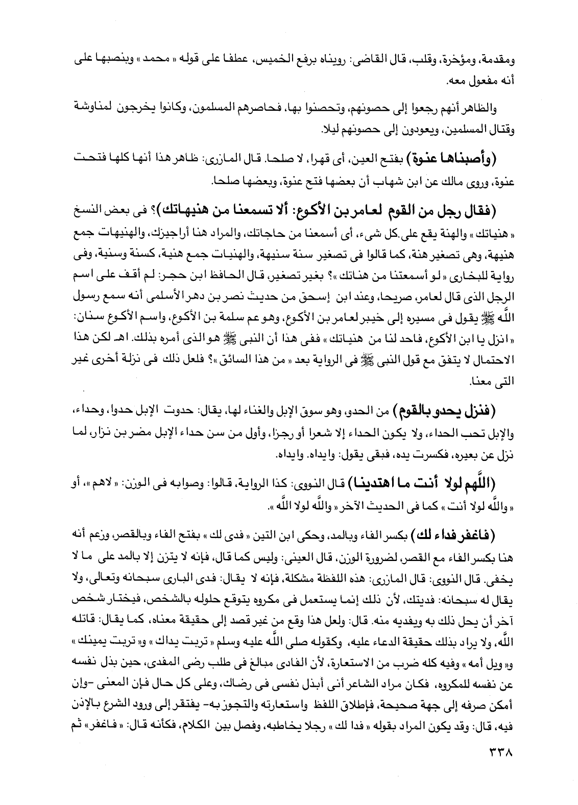 (فقال رجل من القوم لعامر بن الأكوع: ألا تسمعنا من هنيهاتك)؟ في بعض النسخ "هنياتك" والهنة يقع على كل شيء، أي أسمعنا من حاجاتك، والمراد هنا أراجيزك، والهنيهات جمع هنيهة، وهي تصغير هنة، كما قالوا في تصغير سنة سنيهة، والهنيات جمع هنية، كسنة وسنية، وفي رواية للبخاري "لو أسمعتنا من هناتك"؟ بغير تصغير، قال الحافظ ابن حجر: لم أقف على اسم الرجل الذي قال لعامر، صريحا، وعند ابن إسحق من حديث نصر بن دهر الأسلمي أنه سمع رسول الله صلى الله عليه وسلم يقول في مسيره إلى خيبر لعامر بن الأكوع، وهو عم سلمة بن الأكوع، واسم الأكوع سنان: "انزل يا ابن الأكوع، فاحد لنا من هنياتك" ففي هذا أن النبي صلى الله عليه وسلم هو الذي أمره بذلك. اهـ لكن هذا الاحتمال لا يتفق مع قول النبي صلى الله عليه وسلم في الرواية بعد "من هذا السائق"؟ فلعل ذلك في نزلة أخرى غير التي معنا.