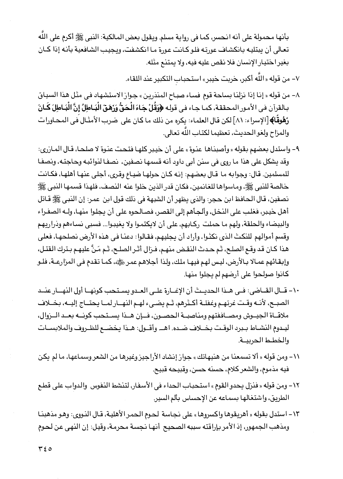 10 - قال القاضي: في هذا الحديث أن الإغارة على العدو يستحب كونها أول النهار عند الصبح، لأنه وقت غرتهم وغفلة أكثرهم، ثم يضيء لهم النهار لما يحتاج إليه، بخلاف ملاقاة الجيوش ومصاففتهم ومناصبة الحصون، فإن هذا يستحب كونه بعد الزوال، ليدوم النشاط ببرد الوقت بخلاف ضده. اهـ وأقول: هذا يخضع للظروف والملابسات والخطط الحربية.