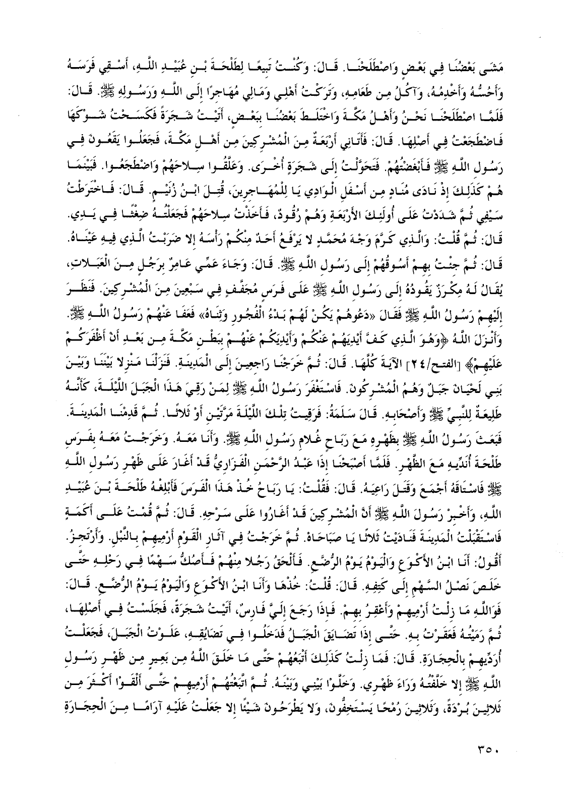 مشى بعضنا في بعض واصطلحنا. قال: وكنت تبيعا لطلحة بن عبيد الله، أسقي فرسه وأحسه وأخدمه، وآكل من طعامه، وتركت أهلي ومالي مهاجرا إلى الله ورسوله صلى الله عليه وسلم. قال: فلما اصطلحنا نحن وأهل مكة واختلط بعضنا ببعض، أتيت شجرة فكسحت شوكها فاضطجعت في أصلها. قال: فأتاني أربعة من المشركين من أهل مكة، فجعلوا يقعون في رسول الله صلى الله عليه وسلم فأبغضتهم. فتحولت إلى شجرة أخرى. وعلقوا سلاحهم واضطجعوا. فبينما هم كذلك إذ نادى مناد من أسفل الوادي يا للمهاجرين، قتل ابن زنيم. قال: فاخترطت سيفي ثم شددت على أولئك الأربعة وهم رقود، فأخذت سلاحهم فجعلته ضغثا في يدي.