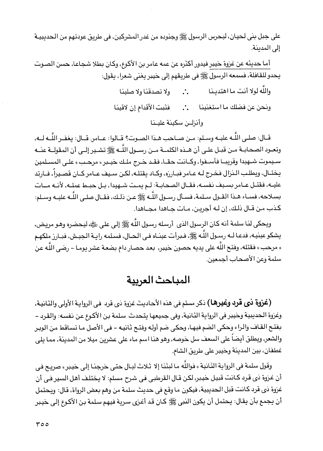 (غزوة ذي قرد وغيرها) ذكر مسلم في هذه الأحاديث غزوة ذي قرد في الرواية الأولى والثانية وغزوة الحديبية وخيبر في الرواية الثانية، وفي جميعها يتحدث سلمة بن الأكوع عن نفسه: والقرد -بفتح القاف والراء وحكي الضم فيها، وحكي ضم أوله وفتح ثانيه- في الأصل ما تساقط من الوبر والشعر، ويطلق أيضا على السعف سل خوصه، وهو هنا اسم ماء على عشرين ميلا من المدينة، مما يلي غطفان، بين المدينة وخيبر على طريق الشام.