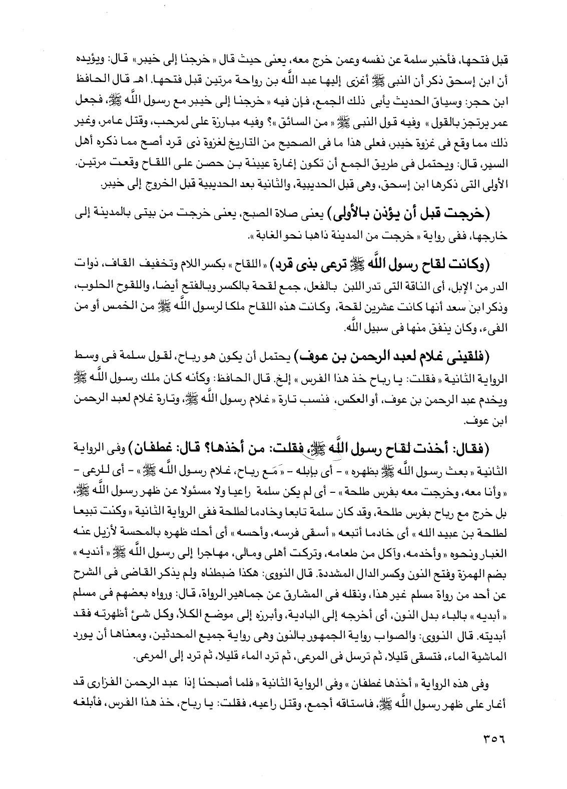 وفي هذه الرواية " أخذها غطفان" وفي الرواية الثانية "فلما أصبحنا إذا عبد الرحمن الفزاري قد أغار على ظهر رسول الله صلى الله عليه وسلم، فاستاقه أجمع، وقتل راعيه، فقلت: يا رباح، خذ هذا الفرس، فأبلغه