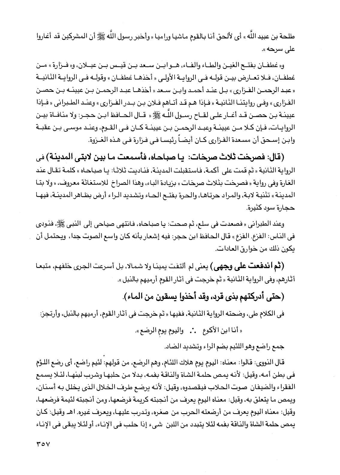و"غطفان بفتح الغين والطاء والفاء، هو ابن سعد بن قيس بن عيلان، و"فزارة" من غطفان، فلا تعارض بين قوله في الرواية الأولى "أخذها غطفان" وقوله في الرواية الثانية "عبد الرحمن الفزاري" بل عند أحمد وابن سعد "أخذها عبد الرحمن بن عيينه بن حصن الفزاري" وفي روايتنا الثانية "فإذا هم قد أتاهم فلان بن بدر الفزاري" وعند الطبراني "فإذا عيينة بن حصن قد أغار على لقاح رسول الله صلى الله عليه وسلم "قال الحافظ ابن حجر: ولا منافاة بين الروايات، فإن كلا من عيينة وعبد الرحمن بن عيينة كان في القوم، وعند موسى بن عقبة وابن إسحق أن مسعدة الفزاري كان أيضا رئيسا في فزارة في هذه الغزوة.