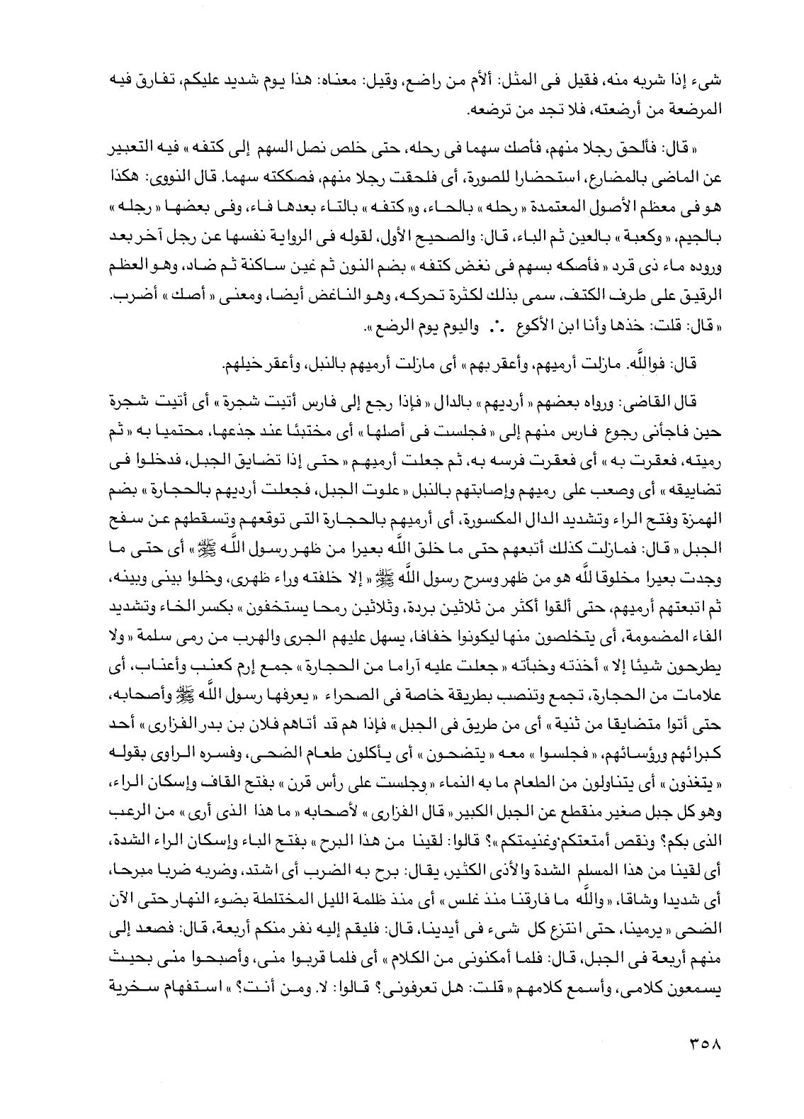 "قال: فألحق رجلا منهم، فأصك سهما في رحله، حتى خلص نصل السهل إلى كتفه" فيه التعبير عن الماضي بالمضارع، استحضارا للصورة، أي فلحقت رجلا منهم، فصككته سهما. قال النووي: هكذا هو في معظم الأصول المعتمدة "رحله" بالحاء، و"كتفه" بالتاء بعدها فاء، وفي بعضها "رجله" بالجيم، "وكعبة" بالعين ثم الباء، قال: والصحيح الأول، لقوله في الرواية نفسها عن رجل آخر بعد وروده ماء ذي قرد "فأصكه بسهم في نغض كتفه" بضم النون ثم غين ساكنة ثم ضاد، وهو العظم الرقيق على طرف الكتف، سمي بذلك لكثرة تحركه، وهو الناغض أيضا، ومعنى "أصك" أضرب.
