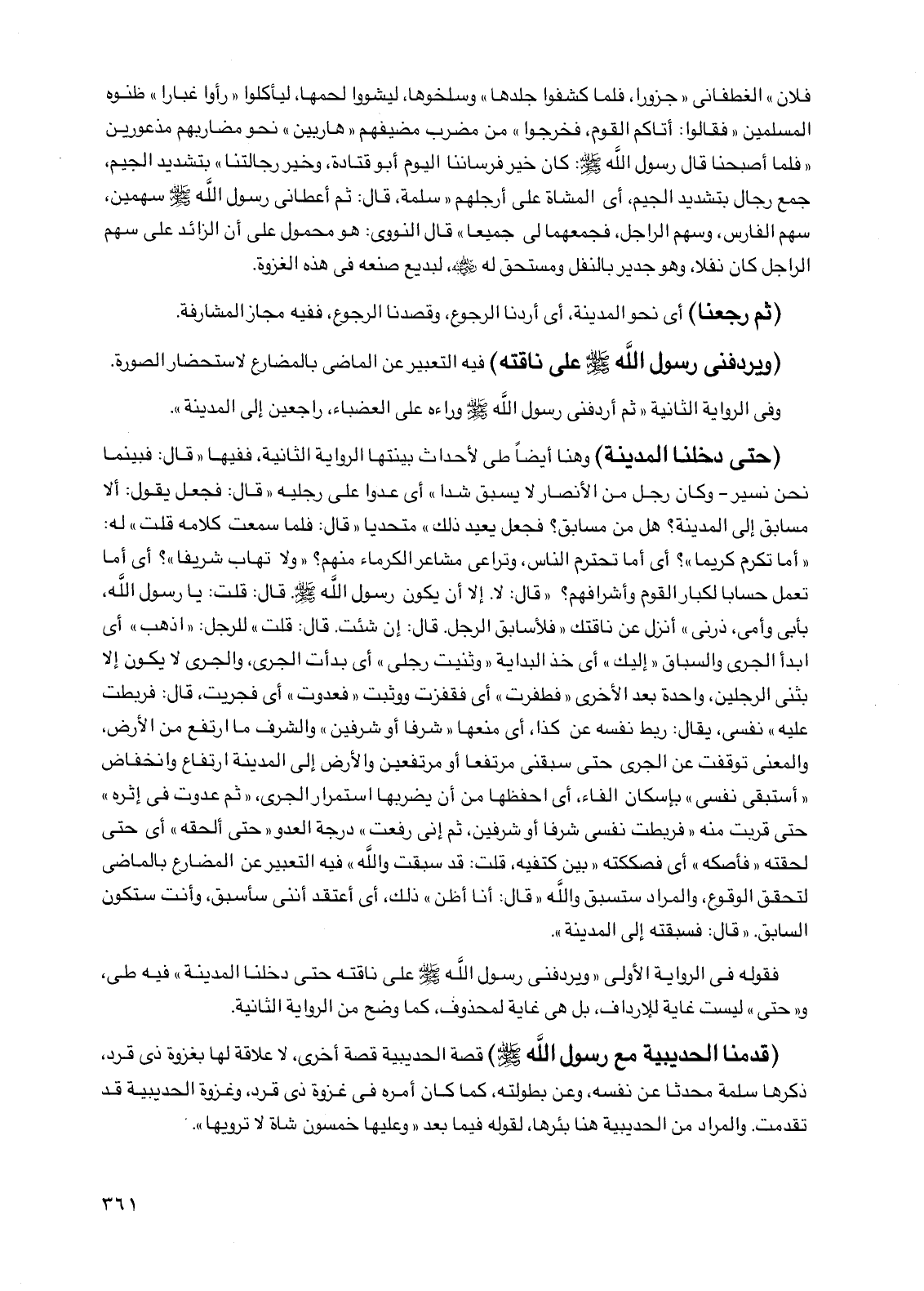 (حتى دخلنا المدينة) وهنا أيضا طي لأحداث بينتها الرواية الثانية، ففيها "قال: فبينما نحن نسير -وكان رجل من الأنصار لا يسبق شدا" أي عدوا على رجليه "قال: فجعل يقول: ألا مسابق إلى المدينة؟ هل من مسابق؟ فجعل يعيد ذلك" متحديا "قال: فلما سمعت كلامه قلت" له: "أما تكرم كريما"؟ أي أما تحترم الناس، وتراعي مشاعر الكرماء منهم؟ "ولا تهاب شريفا"؟ أي أما تعمل حسابا لكبار القوم وأشرافهم؟ "قال: لا، إلا أن يكون رسول الله صلى الله عليه وسلم، قال: قلت: يا رسول الله، بأبي وأمي، ذرني" أنزل عن ناقتك "فلأسابق الرجل. قال: إن شئت. قال: قلت" للرجل: "اذهب" أي ابدأ الجري والسباق "إليك" أي خذ البداية "وثنيت رجلي" أي بدأت الجري، والجري لا يكون إلا بثني الرجلين، واحدة بعد الأخرى "فطفرت" أي فقفزت ووثبت "فعدوت" أي فجريت، قال: فربطت عليه" نفسي، يقال: ربط نفسه عن كذا، أي منعها "شرفا أو شرفين" والشرف ما ارتفع من الأرض، والمعنى توقفت عن الجري حتى سبقني مرتفعا أو مرتفعين والأرض إلى المدينة ارتفاع وانخفاض "أستبقى نفسي" بإسكان الفاء، أي احفظها من أن يضربها استمرار الجري، "ثم عدوت في إثره" حتى قربت منه "فربطت نفسي شرفا أو شرفين، ثم إني رفعت" درجة العدو "حتى ألحقه" أي حتى لحقته "فأصكه" أي فصككته "بين كتفيه، قلت: قد سبقت والله" فيه التعبير عن المضارع بالماضي لتحقق الوقوع، والمراد ستسبق والله "قال: أنا أظن" ذلك، أي أعتقد أنني سأسبق، وأنت ستكون السابق. "قال: فسبقته إلى المدينة".
