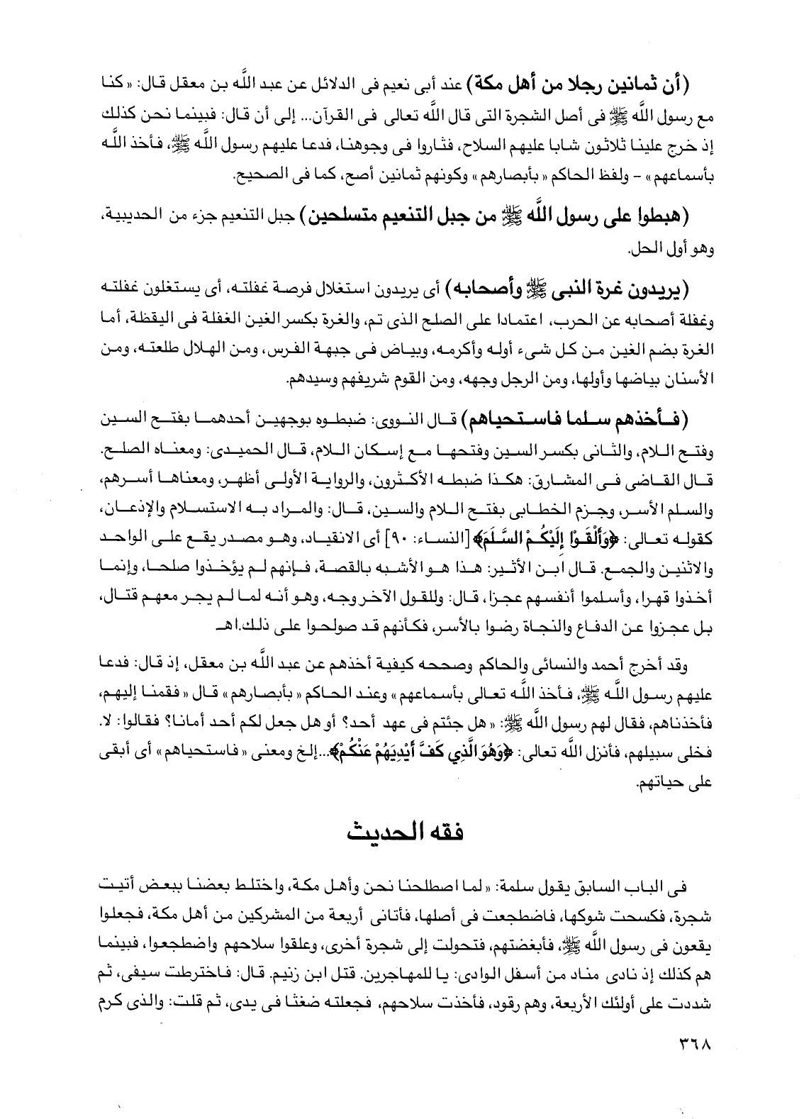 (أن ثمانين رجلا من أهل مكة) عند أبي نعيم في الدلائل عن عبد الله بن معقل قال: "كنا مع رسول الله صلى الله عليه وسلم في أصل الشجرة التي قال الله تعالى في القرآن .... إلى أن قال: فبينما نحن كذلك إذ خرج علينا ثلاثون شابا عليهم السلاح، فثاروا في وجوهنا، فدعا عليهم رسول الله صلى الله عليه وسلم فأخذ الله بأسماعهم" -ولفظ الحاكم "بأبصارهم" وكونهم ثمانين أصح، كما في الصحيح.