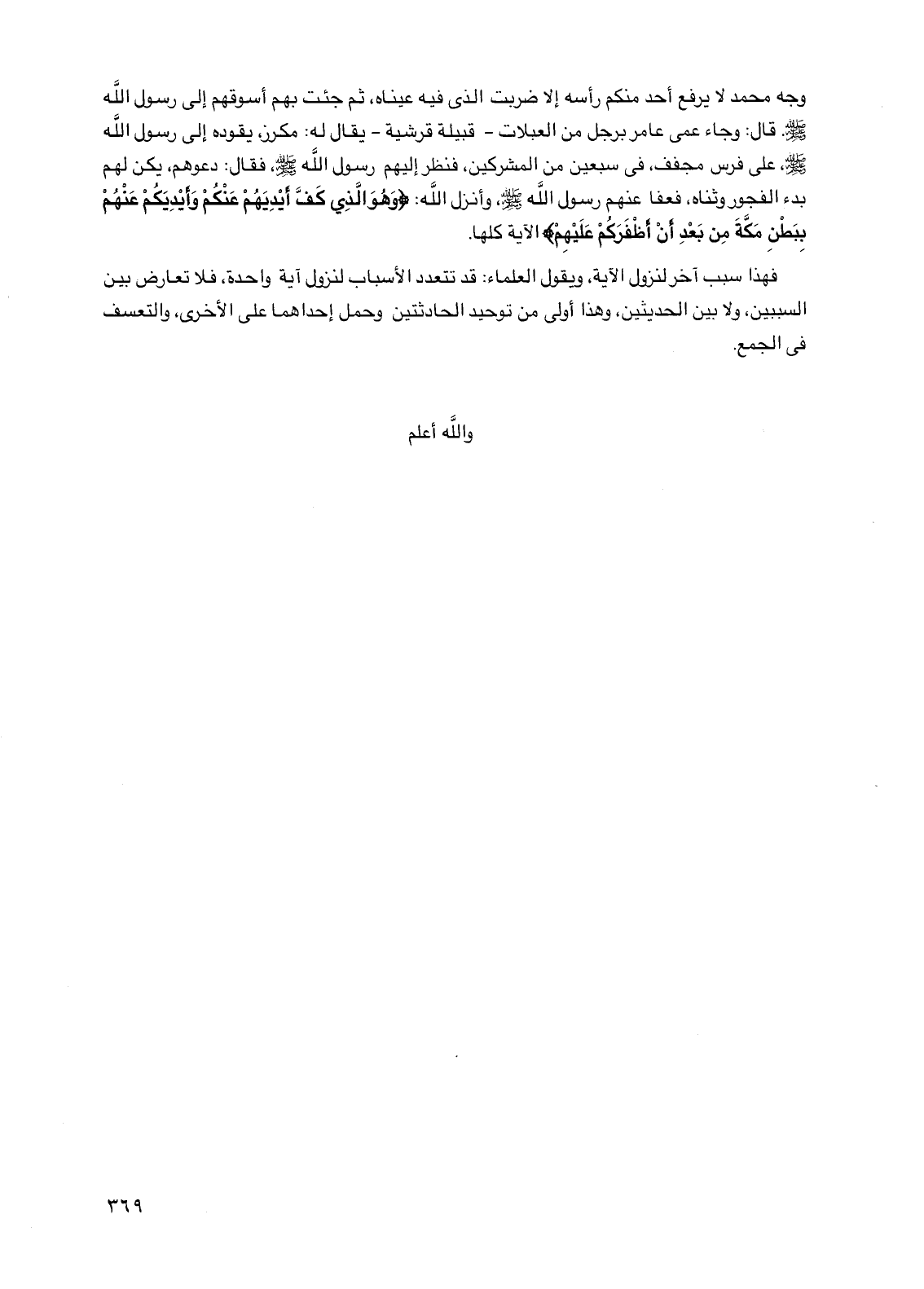 وجه محمد لا يرفع أحد منكم رأسه إلا ضربت الذي فيه عيناه، ثم جئت بهم أسوقهم إلى رسول الله صلى الله عليه وسلم قال: وجاء عمي عامر برجل من العبلات -قبيلة قرشية- يقال له: مكرز، يقوده إلى رسول الله صلى الله عليه وسلم، على فرس مجفف، في سبعين من المشركين، فنظر إليهم رسول الله صلى الله عليه وسلم فقال: دعوهم، يكن لهم بدء الفجور وثناه، فعفا عنهم رسول الله صلى الله عليه وسلم وأنزل الله: {وهو الذي كف أيديهم عنكم وأيديكم عنهم ببطن مكة من بعد أن أظفركم عليهم} الآية كلها.