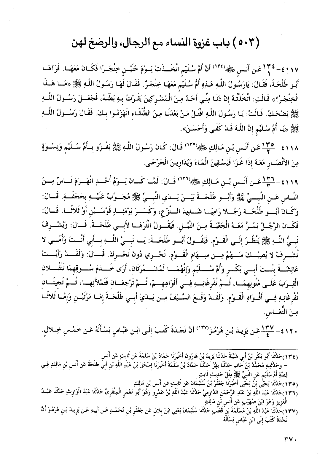 4118 - عن أنس بن مالك رضي الله عنه قال: كان رسول الله صلى الله عليه وسلم يغزو بأم سليم ونسوة من الأنصار معه إذا غزا فيسقين الماء ويداوين الجرحى.