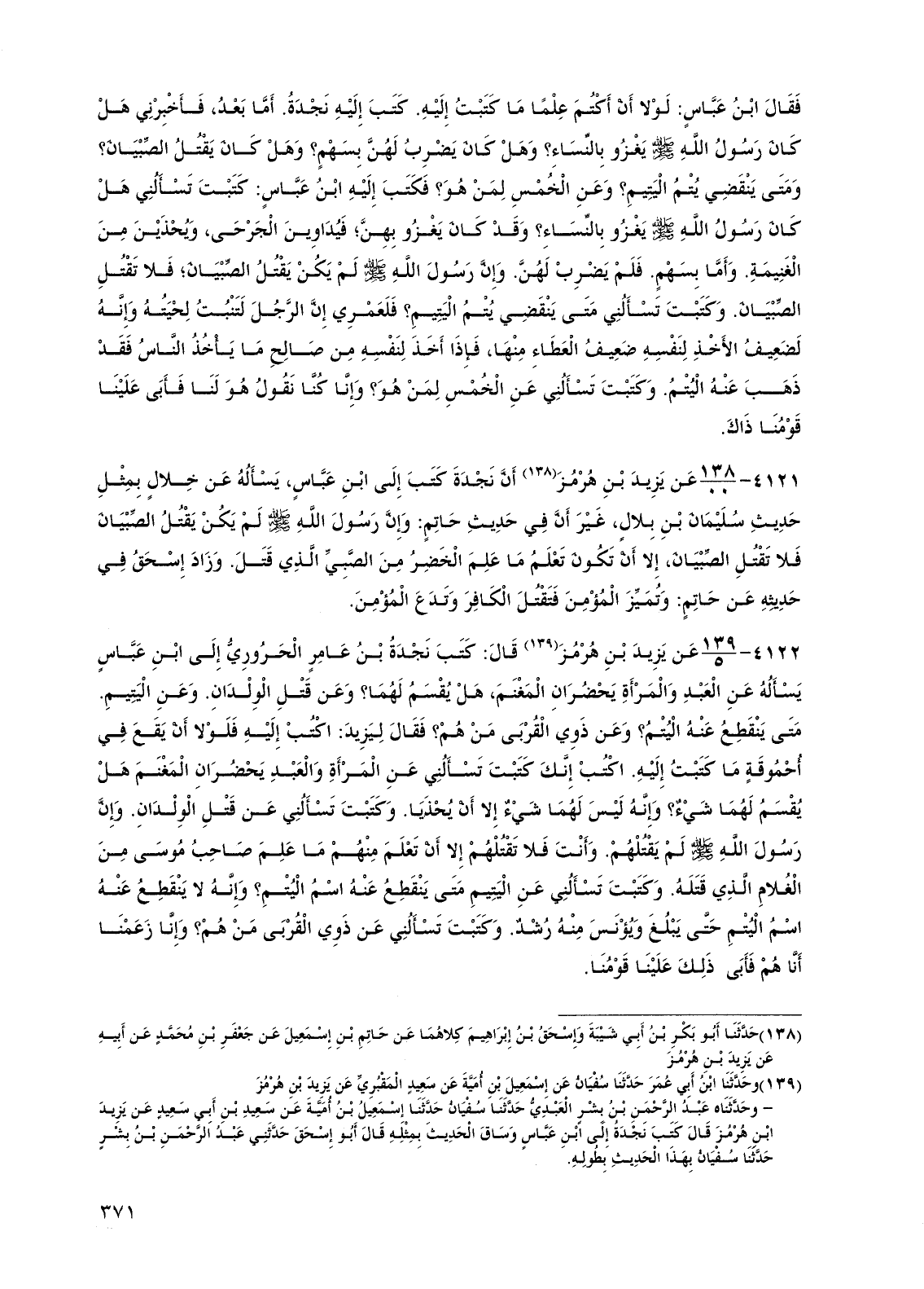 4122 - عن يزيد بن هرمز قال: كتب نجدة بن عامر الحروري إلى ابن عباس يسأله عن العبد والمرأة يحضران المغنم، هل يقسم لهما؟ وعن قتل الولدان، وعن اليتيم. متى ينقطع عنه اليتم؟ وعن ذوي القربى من هم؟ فقال ليزيد: اكتب إليه فلولا أن يقع في أحموقة ما كتبت إليه. اكتب إنك كتبت تسألني عن المرأة والعبد يحضران المغنم هل يقسم لهما شيء؟ وإنه ليس لهما شيء إلا أن يحذيا. وكتبت تسألني عن قتل الولدان. وإن رسول الله صلى الله عليه وسلم لم يقتلهم. وأنت فلا تقتلهم إلا أن تعلم منهم ما علم صاحب موسى من الغلام الذي قتله. وكتبت تسألني عن اليتيم متى ينقطع عنه اسم اليتيم؟ وإنه لا ينقطع عنه اسم اليتم حتى يبلغ ويؤنس منه رشد. وكتبت تسألني عن ذوي القربى من هم؟ وإنا زعمنا أنا هم فأبى ذلك علينا قومنا.