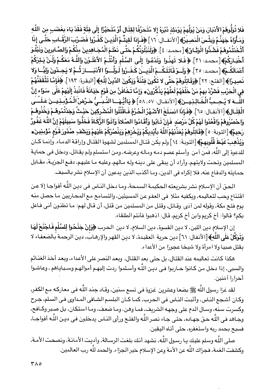 فلا تولوهم الأدبار ومن يولهم يومئذ دبره إلا متحرفا لقتال أو متحيزا إلى فئة فقد باء بغضب من الله ومأواه جهنم وبئس المصير} [الأنفال: 16] {فإذا لقيتم الذين كفروا فضرب الرقاب حتى إذا أثخنتموهم فشدوا الوثاق} [محمد: 4] {ولنبلونكم حتى نعلم المجاهدين منكم والصابرين ونبلو أخباركم} [محمد: 31] {فلا تهنوا وتدعوا إلى السلم وأنتم الأعلون والله معكم ولن يتركم أعمالكم} [محمد: 35] {ولو قاتلكم الذين كفروا لولوا الأدبار ثم لا يجدون وليا ولا نصيرا} [الفتح: 22] {وقاتلوهم حتى لا تكون فتنة ويكون الدين لله} [البقرة: 193] {فإما تثقفنهم في الحرب فشرد بهم من خلفهم لعلهم يذكرون* وإما تخافن من قوم خيانة