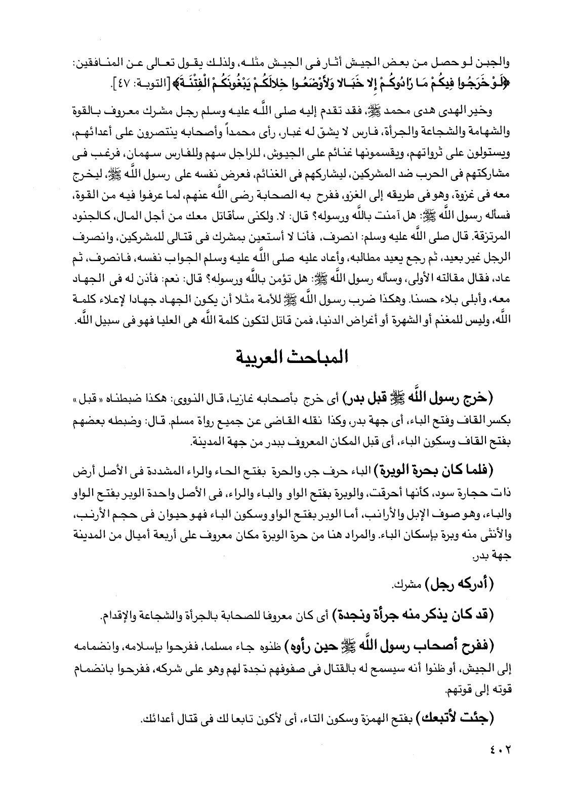 (فلما كان بحرة الوبرة) الباء حرف جر، والحرة بفتح الحاء والراء المشددة في الأصل أرض ذات حجارة سود، كأنها أحرقت، والوبرة بفتح الواو والباء والراء، في الأصل واحدة الوبر بفتح الواو والباء، وهو صوف الإبل والأرانب، أما الوبر بفتح الواو وسكون الباء فهو حيوان في حجم الأرنب، والأنثى منه وبرة بإسكان الباء. والمراد هنا من حرة الوبرة مكان معروف على أربعة أميال من المدينة جهة بدر.