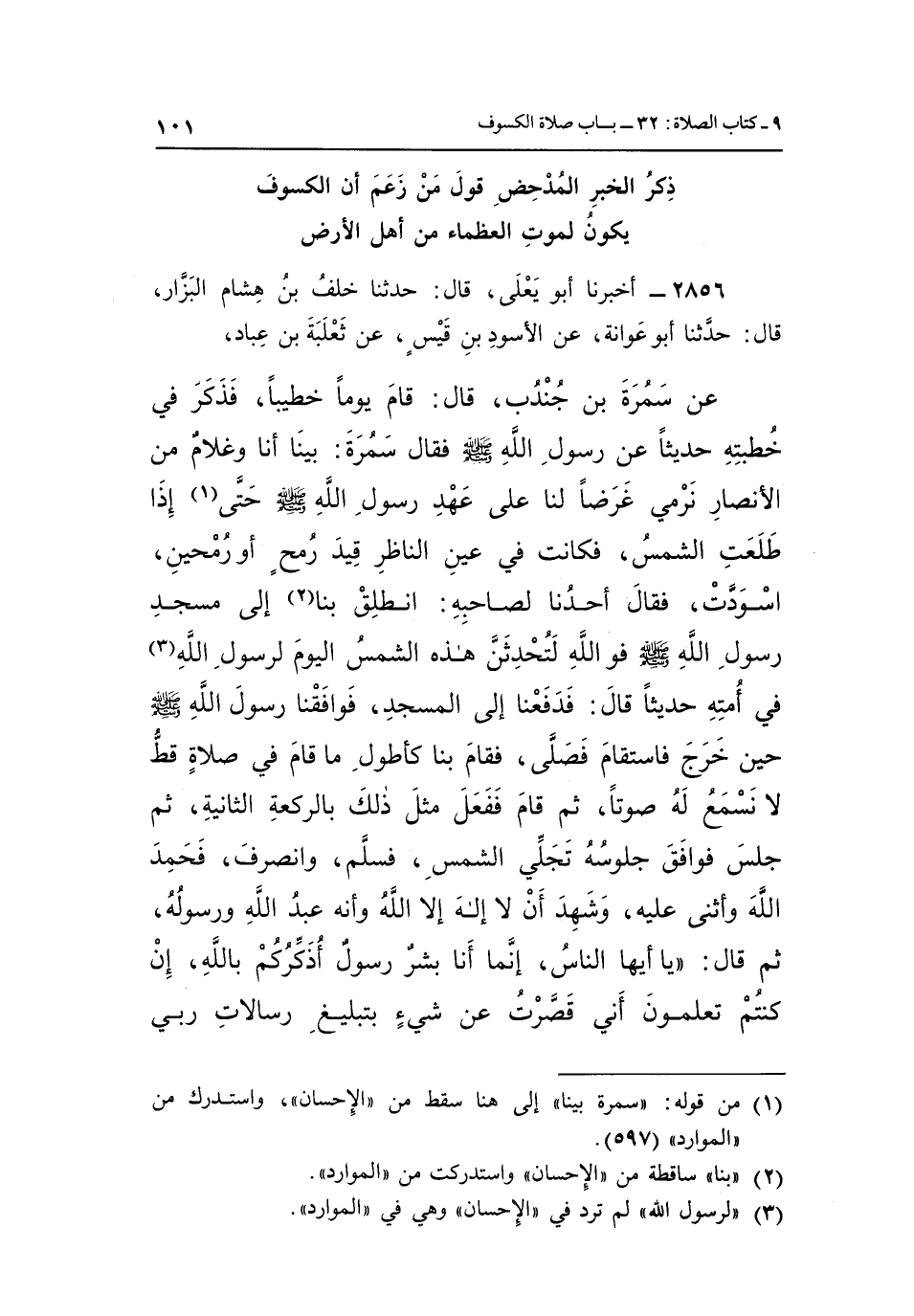 عَنْ سَمُرَةَ بْنِ جُنْدُبٍ قَالَ: قَامَ يَوْمًا خَطِيبًا فَذَكَرَ فِي خُطْبَتِهِ حَدِيثًا عَنْ رَسُولِ اللَّهِ صَلَّى اللَّهُ عَلَيْهِ وَسَلَّمَ فَقَالَ سَمُرَةُ: بَيْنَا أَنَا وَغُلَامٌ مِنَ الْأَنْصَارِ نَرْمِي غَرَضًا لَنَا عَلَى عَهْدِ رَسُولِ اللَّهِ صَلَّى اللَّهُ عَلَيْهِ وَسَلَّمَ حَتَّى1 إِذَا طَلَعَتِ الشَّمْسُ فَكَانَتْ فِي عَيْنِ النَّاظِرِ قِيدَ رُمْحٍ أَوْ رُمْحَيْنِ اسْوَدَّتْ فَقَالَ أَحَدُنَا لِصَاحِبِهِ: انْطَلَقَ بِنَا2 إِلَى مَسْجِدَ رَسُولِ اللَّهِ صَلَّى اللَّهُ عَلَيْهِ وَسَلَّمَ فَوَاللَّهِ لَتُحْدِثَنَّ هَذِهِ الشَّمْسُ الْيَوْمَ لِرَسُولِ اللَّهِ3 فِي أُمَّتِهِ حَدِيثًا قَالَ: فَدَفَعْنَا إِلَى الْمَسْجِدِ فَوَافَقْنَا رَسُولُ اللَّهِ صَلَّى اللَّهُ عَلَيْهِ وَسَلَّمَ حِينَ خَرَجَ فَاسْتَقَامَ فَصَلَّى فَقَامَ بِنَا كَأَطْوَلِ مَا قَامَ فِي صَلَاةٍ قَطُّ لَا نَسْمَعُ لَهُ صَوْتًا ثُمَّ قَامَ فَفَعَلَ مِثْلَ ذَلِكَ بِالرَّكْعَةِ الثَّانِيَةِ ثُمَّ جَلَسَ فَوَافَقَ جُلُوسَهُ تَجَلِّي الشَّمْسِ فَسَلَّمَ وَانْصَرَفَ فَحَمِدَ اللَّهَ وَأَثْنَى عَلَيْهِ وَشَهِدَ أَنْ لَا إِلَهَ إِلَّا اللَّهُ وَأَنَّهُ عَبْدُ اللَّهِ وَرَسُولُهُ ثُمَّ قَالَ: "يَا أَيُّهَا الناس إنما بَشَرٌ رَسُولٌ أُذَكِّرُكُمْ بِاللَّهِ إِنْ كُنْتُمْ تَعْلَمُونَ أَنِّي قَصَّرْتُ عَنْ شَيْءٍ بِتَبْلِيغِ رِسَالَاتِ رَبِّي