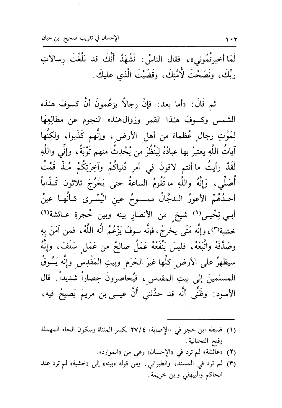 ثُمَّ قَالَ: "أَمَا بَعْدُ: فَإِنَّ رِجَالًا يَزْعُمُونَ أَنَّ كُسُوفَ هَذِهِ الشَّمْسِ وَكُسُوفَ هَذَا الْقَمَرِ وَزَوَالِ هَذِهِ النُّجُومِ عَنْ مَطَالِعِهَا لِمَوْتِ رِجَالٍ عُظَمَاءَ مِنْ أَهْلِ الْأَرْضِ وَإِنَّهُمْ كَذَبُوا وَلَكِنَّهَا آيَاتُ اللَّهِ يَعْتَبِرُ بِهَا عِبَادُهُ لَيَنْظُرَ مَنْ يُحَدِّثُ مِنْهُمْ تَوْبَةً وَإِنِّي وَاللَّهِ لَقَدْ رَأَيْتُ مَا أَنْتُمْ لَاقُونَ فِي أَمْرِ دُنْيَاكُمْ وَأَخِرَتِكُمْ مُذْ قُمْتُ أُصَلِّي وَإِنَّهُ وَاللَّهِ مَا تَقُومُ السَّاعَةُ حَتَّى يَخْرُجَ ثَلَاثُونَ كَذَّابًا أَحَدُهُمُ الْأَعْوَرُ الدَّجَّالُ مَمْسُوحُ عَيْنِ الْيُسْرَى كَأَنَّهَا عَيْنُ أَبِي تِحْيَى 1 شَيْخٍ مِنَ الْأَنْصَارِ بَيْنَهُ وَبَيْنَ حُجْرَةِ عَائِشَةَ 2 خَشَبَةٌ 3 وَإِنَّهُ مَتَى يَخْرُجُ فَإِنَّهُ سَوْفَ يَزْعُمُ أَنَّهُ اللَّهُ فَمَنْ آمَنَ بِهِ وَصَدَّقَهُ وَاتَّبَعَهُ فَلَيْسَ يَنْفَعُهُ عَمِلٌ صَالِحٌ مِنْ عَمِلٍ سَلَفَ وَإِنَّهُ سَيَظْهَرُ عَلَى الْأَرْضِ كُلِّهَا غَيْرَ الْحَرَمِ وَبَيْتِ الْمَقْدِسِ وَإِنَّهُ يَسُوقُ الْمُسْلِمِينَ إِلَى بَيْتِ الْمَقْدِسِ فَيُحَاصَرُونَ حِصَارًا شَدِيدًا" قَالَ الْأَسْوَدُ: وَظَنِّي أَنَّهُ قَدْ حَدَّثَنِي "أَنَّ عِيسَى بن مريم يصيح فيه