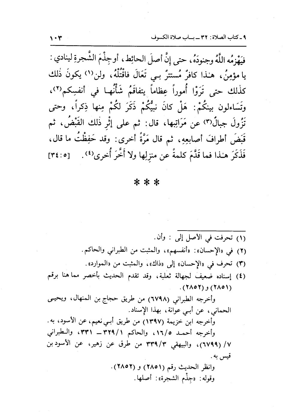 فَيَهْزِمُهُ اللَّهُ وَجُنُودَهُ حَتَّى إِنَّ أَصْلَ الْحَائِطِ أَوْ جِذْمَ الشَّجَرَةِ لَيُنَادِي يَا مُؤْمِنُ هَذَا كَافِرٌ مُسْتَتِرٌ بِي تَعَالَ فَاقْتُلْهُ وَلَنْ 1 يَكُونَ ذَلِكَ كَذَلِكَ حَتَّى تَرَوْا أُمُورًا عِظَامًا يَتَفَاقَمُ شَأْنُهَا فِي أَنْفُسِكُمْ 2 وَتَسَاءَلُونَ بَيْنَكُمْ هَلْ كَانَ نَبِيِّكُمْ ذِكْرُ لَكُمْ مِنْهَا ذِكْرًا وَحَتَّى تَزُولَ جِبَالٌ 3 عَنْ مَرَاتِبِهَا" قَالَ: "ثُمَّ عَلَى إِثْرِ ذَلِكَ الْقَبْضُ ثُمَّ قَبَضَ أَطْرَافَ أَصَابِعِهِ" ثُمَّ قَالَ مَرَّةً أُخْرَى: وَقَدْ حَفِظْتُ مَا قَالَ فَذَكَرَ هَذَا فَمَا قَدَّمَ كَلِمَةً عَنْ مَنْزِلِهَا ولا أخر أخرى4. [34:5]
