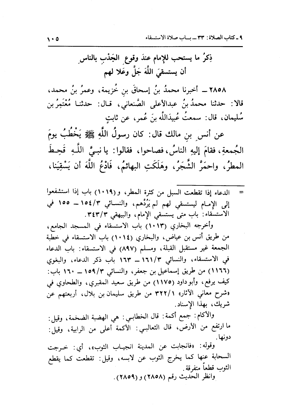 = الدعاء إذا تقطعت السبل من كثرة المطر، و"1019" باب إذا استشفعوا إلى الإمام ليستسقي لهم لم يردهم، والنسائي "3/154-155" في الاستسقاء: باب متى يستسقي الإمام، والبيهقي "3/343".