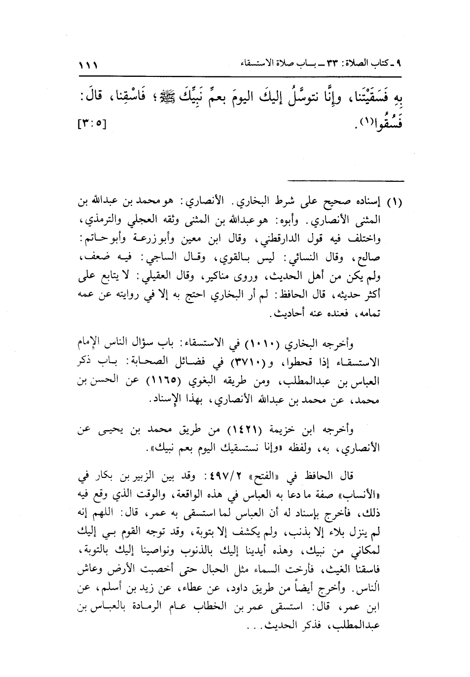 بِهِ فَسَقَيْتَنَا وَأَنَا نَتَوَسَّلُ إِلَيْكَ الْيَوْمَ بِعَمِّ نَبِيِّكَ صَلَّى اللَّهُ عَلَيْهِ وَسَلَّمَ فَاسْقِنَا قَالَ: فسقوا1. [3:5]