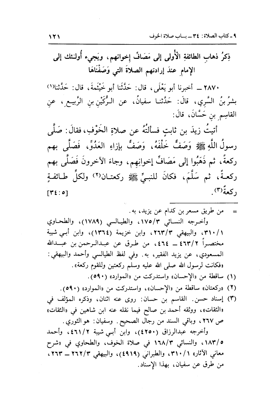 أَتَيْتُ زَيْدَ بْنَ ثَابِتٍ فَسَأَلْتُهُ عَنْ صَلَاةِ الْخَوْفِ فَقَالَ: صَلَّى رَسُولُ اللَّهِ صَلَّى اللَّهُ عَلَيْهِ وَسَلَّمَ وَصَفٌّ خَلْفَهُ وَصَفٌّ بِإِزَاءِ الْعَدُوِّ فَصَلَّى بِهِمْ رَكْعَةً ثُمَّ ذَهَبُوا إِلَى مَصَافِّ إِخْوَانِهِمْ وَجَاءَ الْآخَرُونَ فَصَلَّى بِهِمْ رَكْعَةً ثُمَّ سَلَّمَ فَكَانَ لِلنَّبِيِّ صَلَّى اللَّهُ عَلَيْهِ وَسَلَّمَ رَكْعَتَانِ2 وَلِكُلِّ طائفة ركعة3. [34:5]