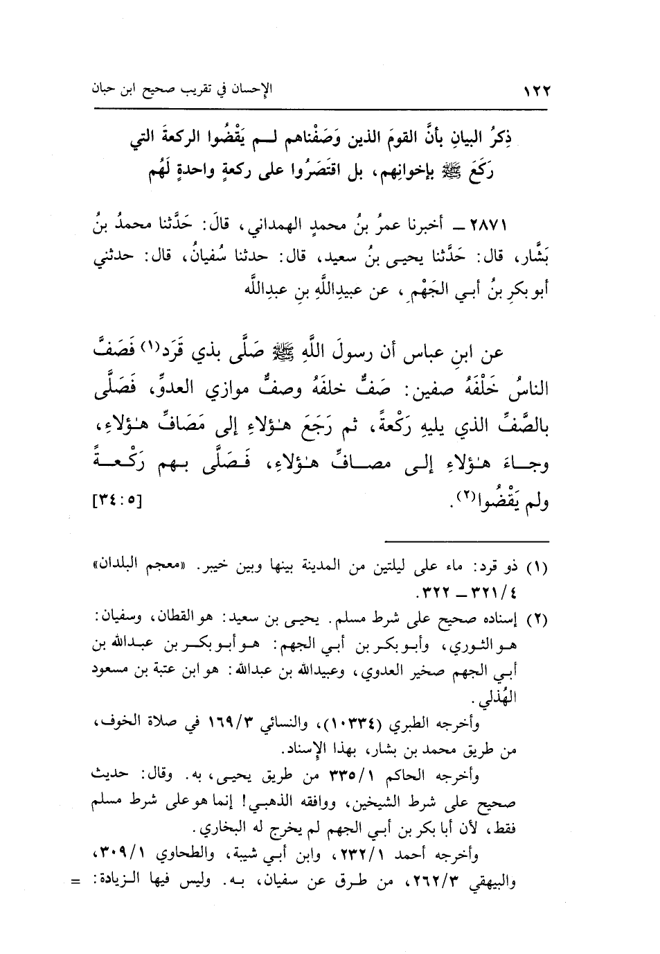 2871 - أَخْبَرَنَا عُمَرُ بْنُ مُحَمَّدٍ الْهَمْدَانِيُّ قَالَ حَدَّثَنَا مُحَمَّدُ بْنُ بَشَّارٍ قَالَ حَدَّثَنَا يَحْيَى بْنُ سَعِيدٍ قَالَ: حَدَّثَنَا سُفْيَانُ قَالَ: حَدَّثَنِي أَبُو بَكْرِ بْنُ أَبِي الْجَهْمِ عَنْ عُبَيْدِ اللَّهِ بْنِ عَبْدِ اللَّهِ عَنِ ابْنِ عَبَّاسٍ أَنَّ رَسُولَ اللَّهِ صَلَّى اللَّهُ عليه وسلم صَلَّى بِذِي قَرَدٍ1 فَصَفَّ النَّاسُ خَلْفَهُ صَفَّيْنِ: صَفٌّ خَلْفَهُ وَصَفٌّ مُوَازِي الْعَدُوِّ فَصَلَّى بِالصَّفِّ الَّذِي يَلِيهِ رَكْعَةً ثُمَّ رَجَعَ هَؤُلَاءِ إِلَى مَصَافِّ هَؤُلَاءِ وَجَاءَ هَؤُلَاءِ إِلَى مَصَافِّ هَؤُلَاءِ فصلى بهم ركعة ولم يقضوا2. [34:5]